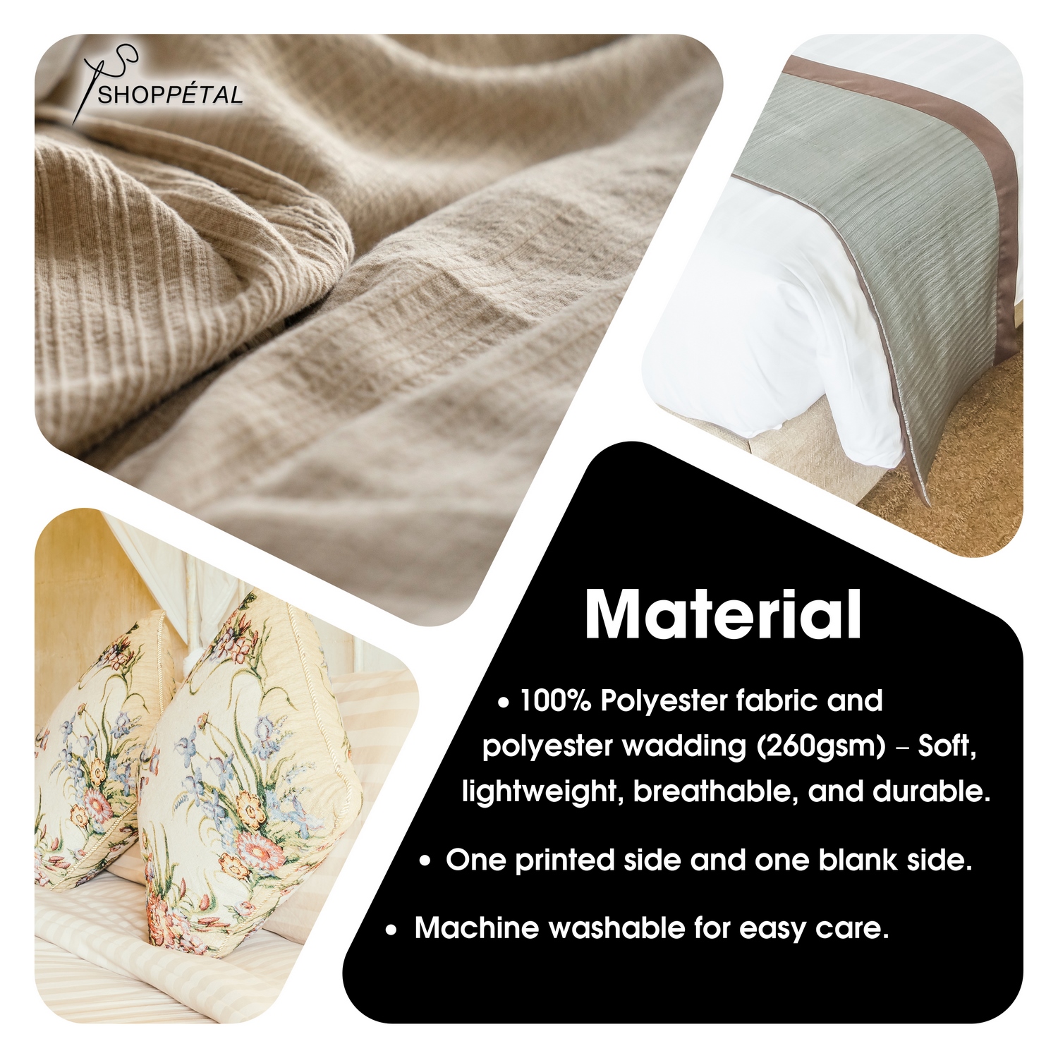 - Material: 100% Polyester fabric and polyester wadding (260gsm) – Soft, lightweight, breathable, and durable.