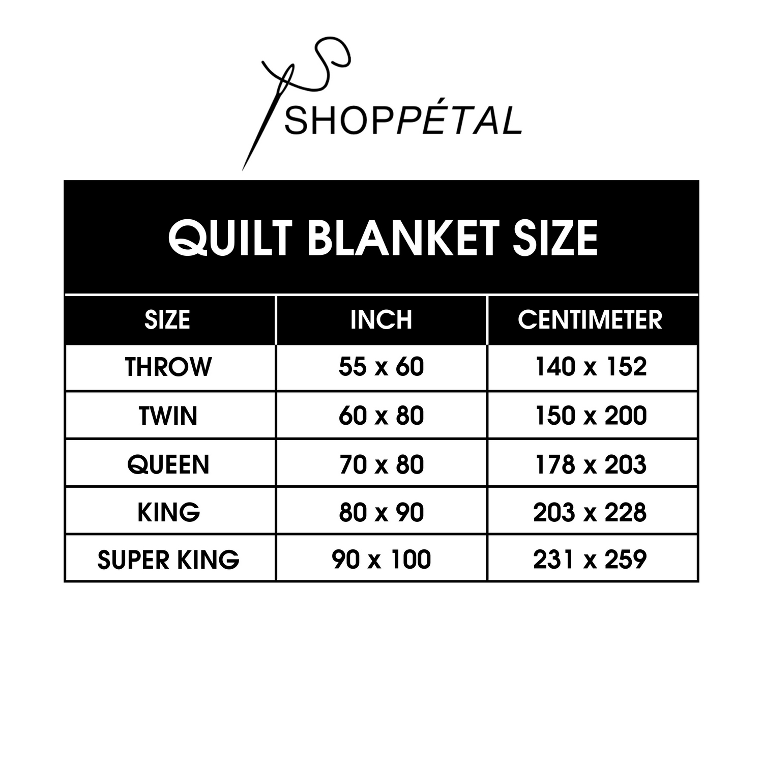 - Super King : 231 cm x 259 cm ( 90 inch x 100 inch).