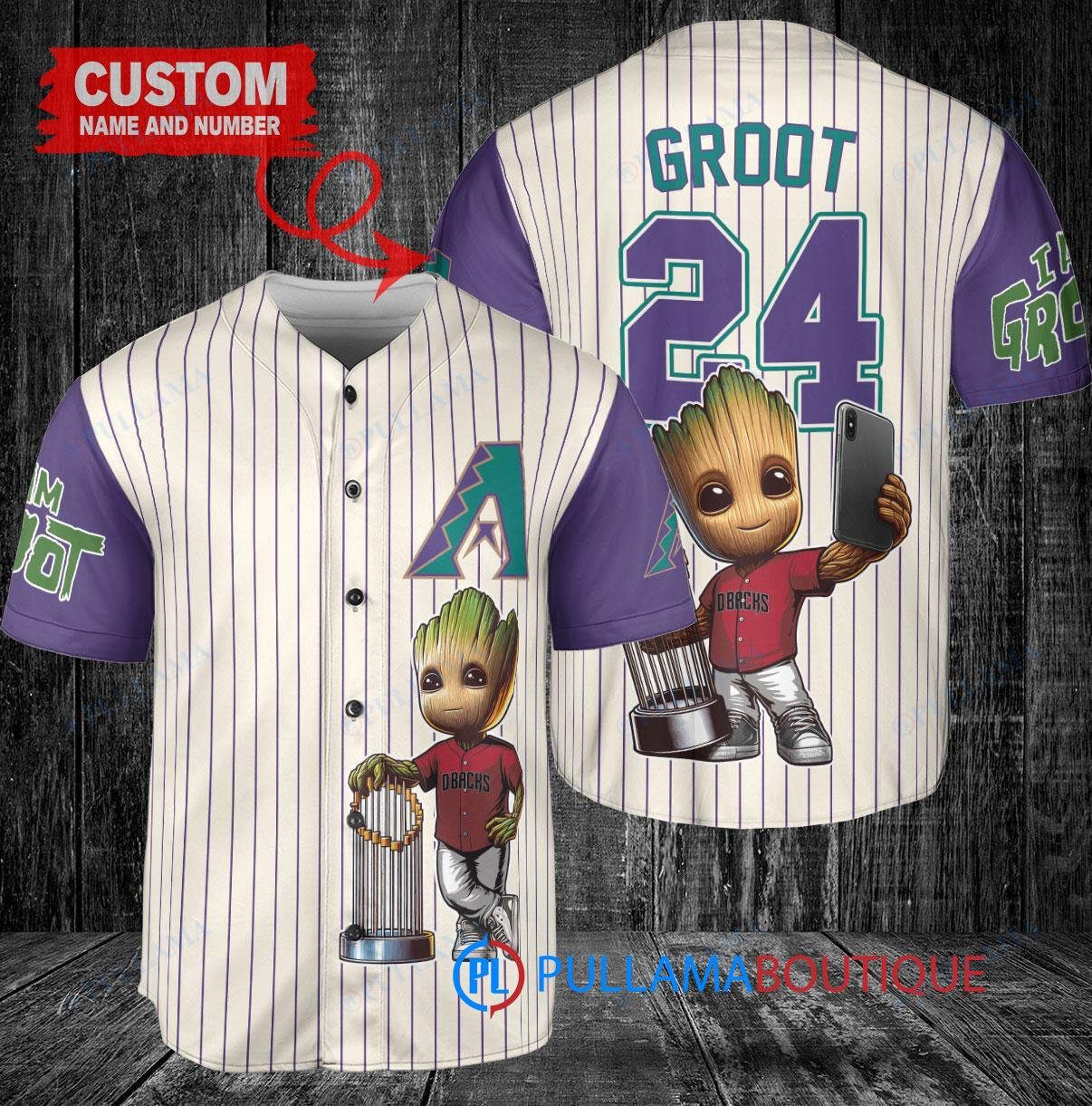 Show off your love for the Arizona Diamondbacks and Baby Groot from Marvel’s Guardians of the Galaxy with this custom baseball jersey. The cream and purple design features Baby Groot holding a trophy, adding a fun and unique touch to your game day outfit. Made with high-quality materials, this jersey is perfect for any baseball fan looking to stand out in the crowd. Get yours today and hit a home run with style!