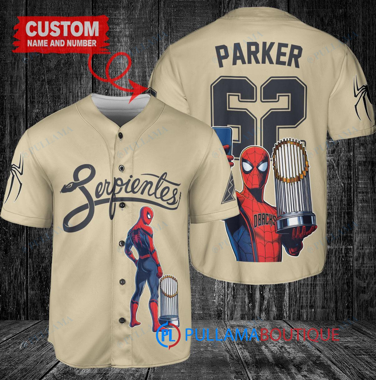Show off your love for the Arizona Diamondbacks and Marvel’s Spiderman with this custom baseball jersey in sand color. The jersey features a unique design of Spiderman holding a trophy, perfect for any fan of the team and the superhero. Made with high-quality materials, this jersey is comfortable to wear while showcasing your favorite characters. Get ready to swing into action with this one-of-a-kind baseball jersey!