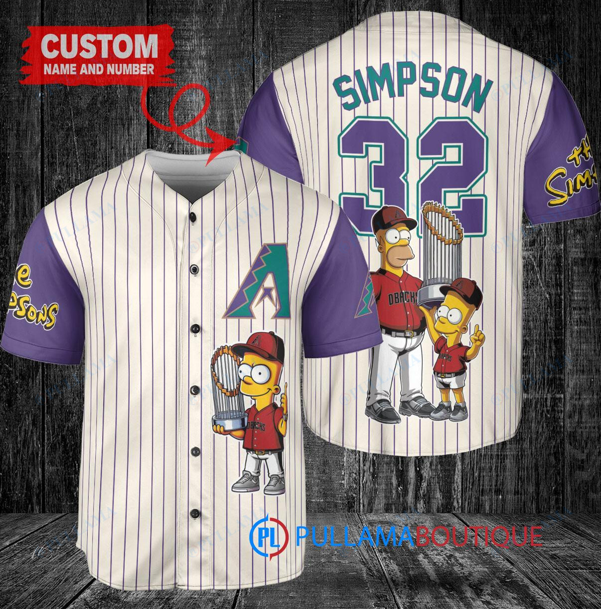 Show your love for the Arizona Diamondbacks and The Simpsons with this custom baseball jersey featuring Bart Simpson, Homer Simpson, and Lisa Simpson holding a trophy. The cream and purple design adds a unique touch to your game day outfit. Perfect for any fan looking to stand out in the crowd.