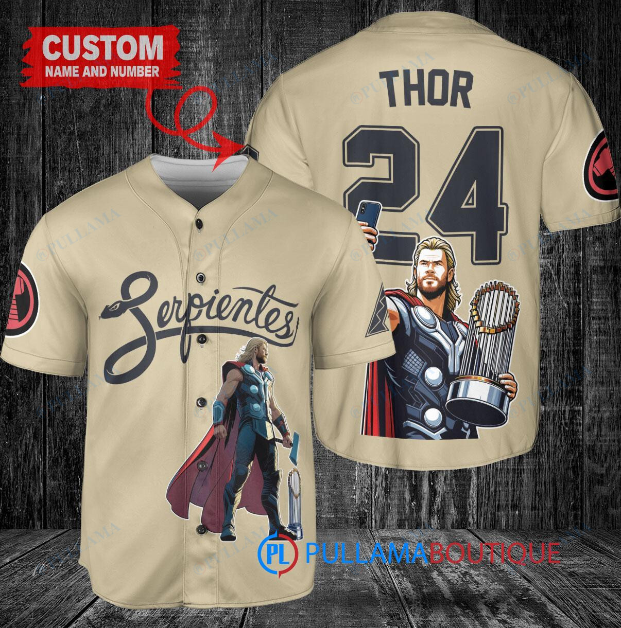 Show off your love for the Arizona Diamondbacks and Thor with this custom baseball jersey in sand color. Featuring a unique design of Thor from Marvel holding a trophy, this jersey is perfect for any fan looking to stand out in the crowd. Made with high-quality materials, this jersey is comfortable to wear while showing off your favorite team and superhero. Get yours today and hit a home run in style!
