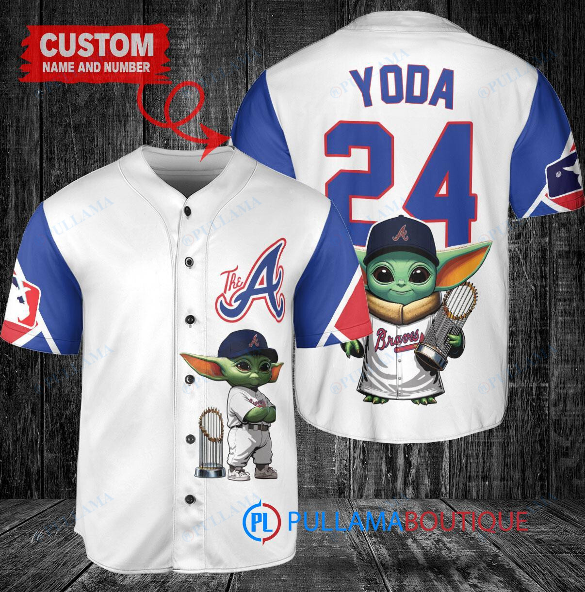 Atlanta Braves x Baby Yoda Star Wars The Mandalorian with Trophy Custom Baseball Jersey White City Connect