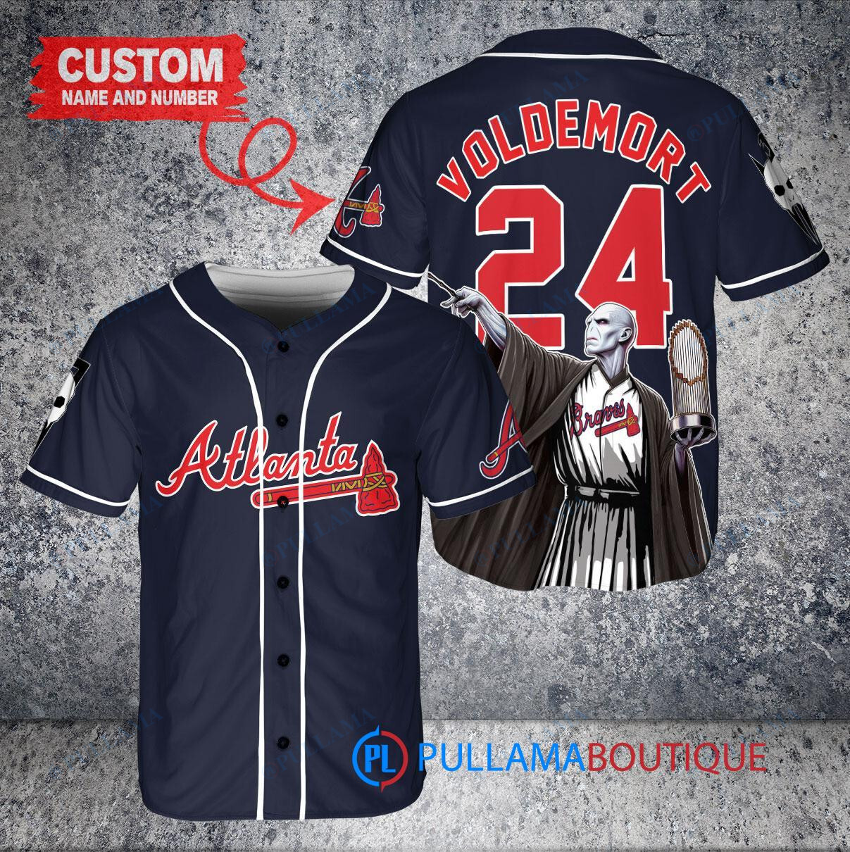 Show off your love for the Atlanta Braves and Harry Potter with this custom baseball jersey featuring Lord Voldemort holding a trophy. This navy jersey is perfect for any fan looking to add a unique and magical touch to their game day outfit. Made with high-quality materials, this jersey is sure to stand out in the crowd. Get yours today and represent your favorite team and wizard in style!