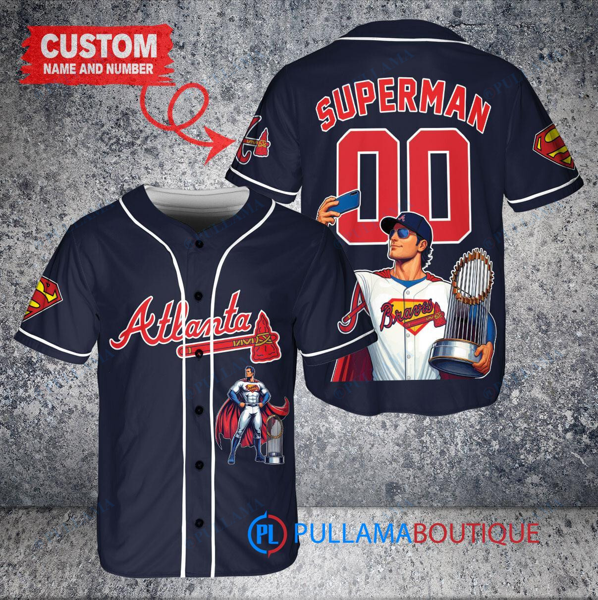 Atlanta Braves x Superman DC Comics with Trophy Custom Baseball Jersey Navy
