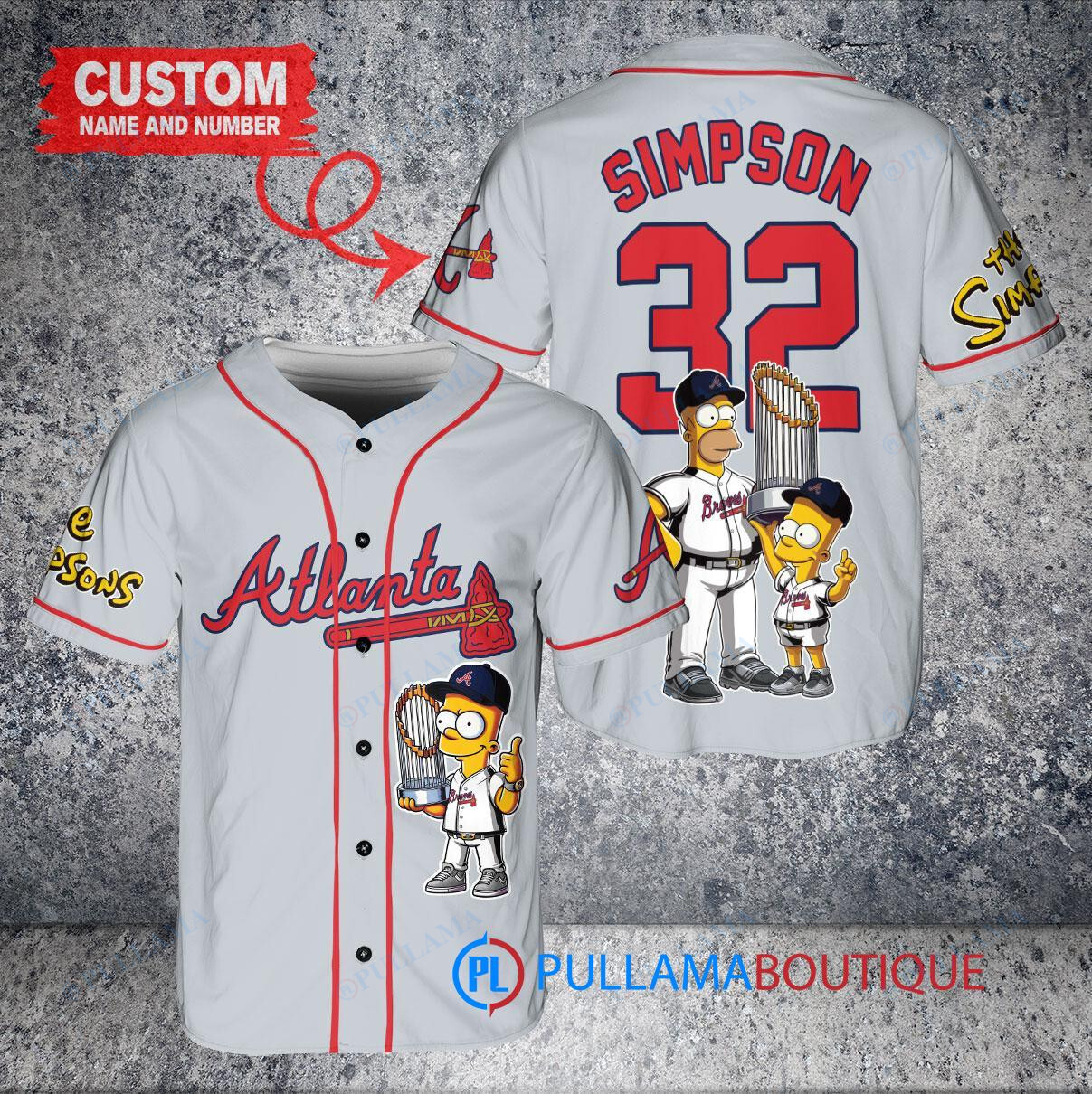 Show off your love for the Atlanta Braves and The Simpsons with this custom baseball jersey featuring Bart Simpson, Homer Simpson, and Lisa Simpson holding a trophy. The gray jersey is perfect for any fan looking to stand out in the crowd. Made with high-quality materials, this jersey is both stylish and comfortable, making it a great addition to any sports memorabilia collection. Get yours today and hit a home run with your fandom!