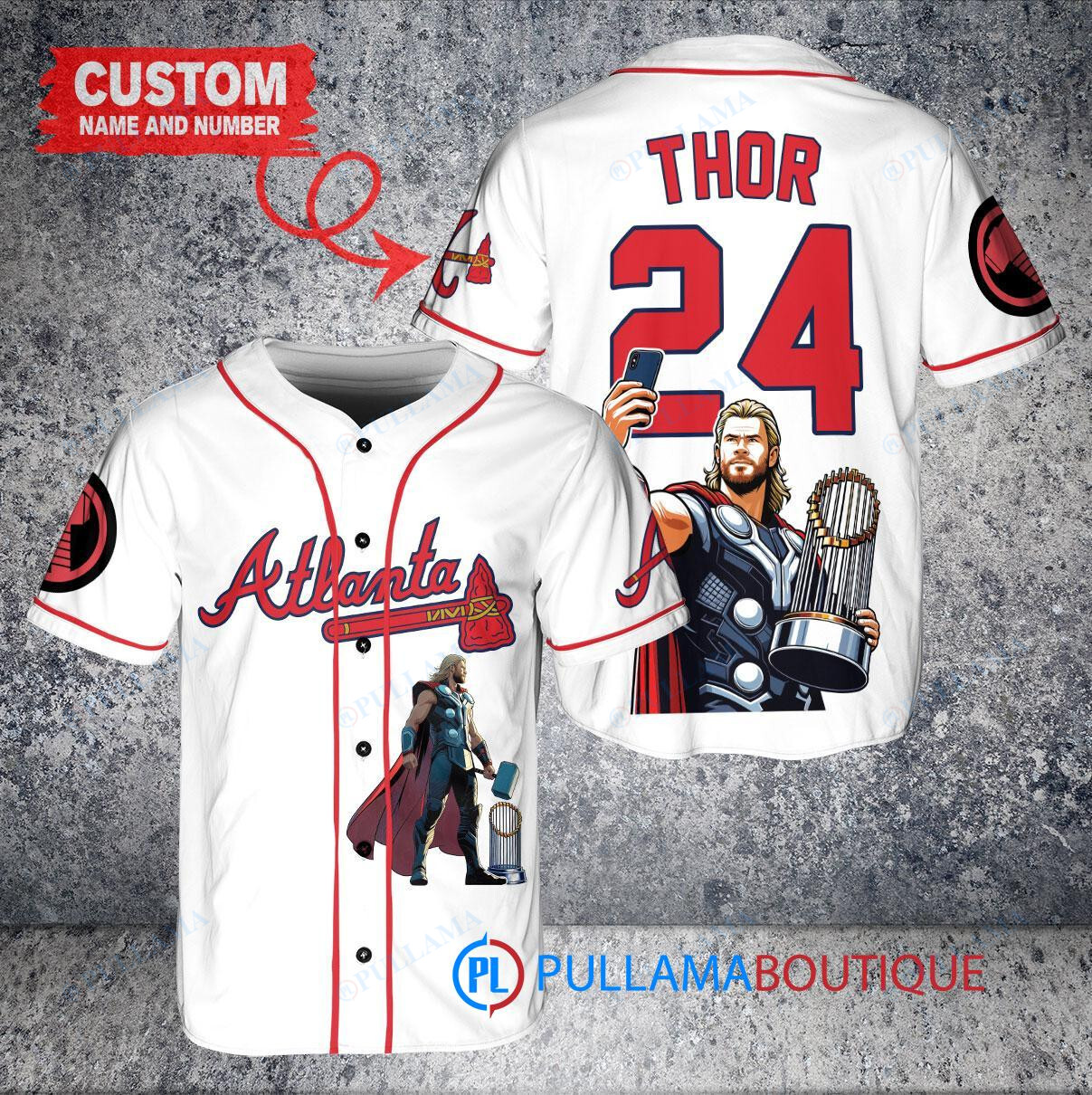 Show off your love for the Atlanta Braves and Thor Marvel with this custom baseball jersey in white. Featuring a unique design with the iconic Thor character holding a trophy, this jersey is perfect for any fan looking to stand out in the crowd. Made with high-quality materials, this jersey is comfortable to wear while cheering on your favorite team. Get yours today and show your support in style!