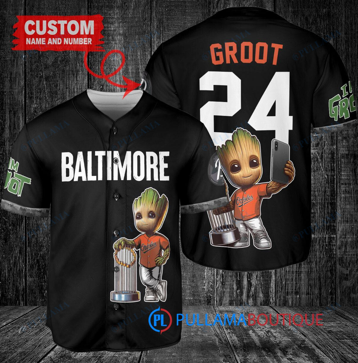 Baltimore Orioles x Baby Groot Marvel Guardians Of The Galaxy with Trophy Custom Baseball Jersey Black City Connect