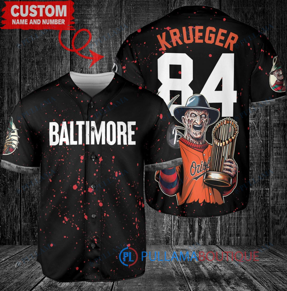Baltimore Orioles x Freddy Krueger A Nightmare on Elm Street Halloween with World Series Trophy Custom Baseball Jersey Black City Connect