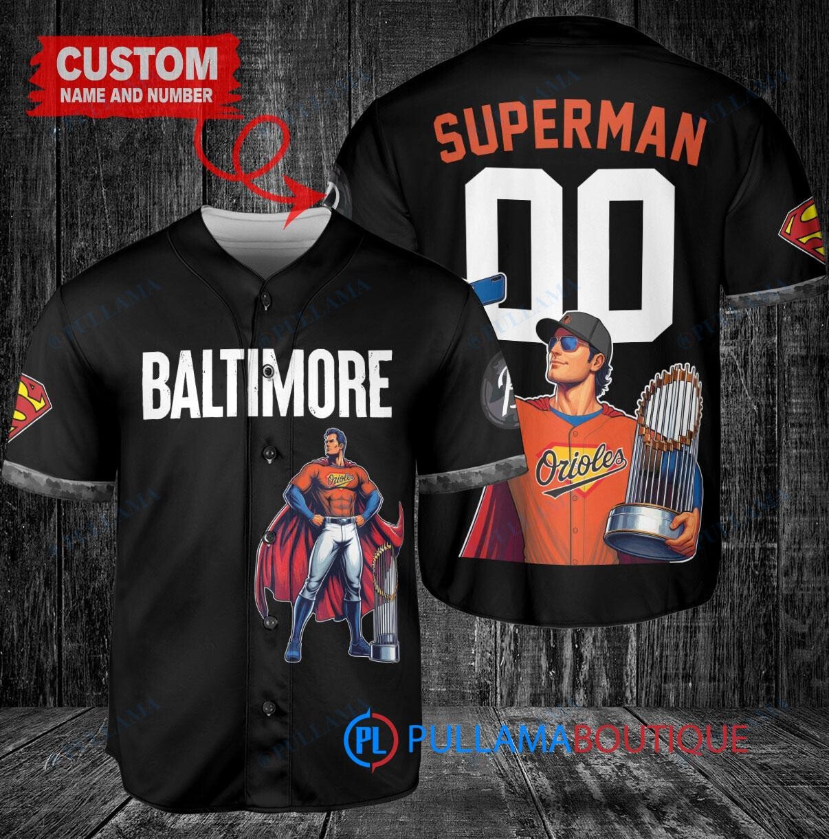Show off your love for the Baltimore Orioles and Superman with this custom baseball jersey featuring a unique City Connect design. The black jersey is adorned with the iconic Superman logo and includes a trophy emblem, perfect for any fan looking to stand out in the crowd. Made with high-quality materials, this jersey is a must-have for any baseball enthusiast.