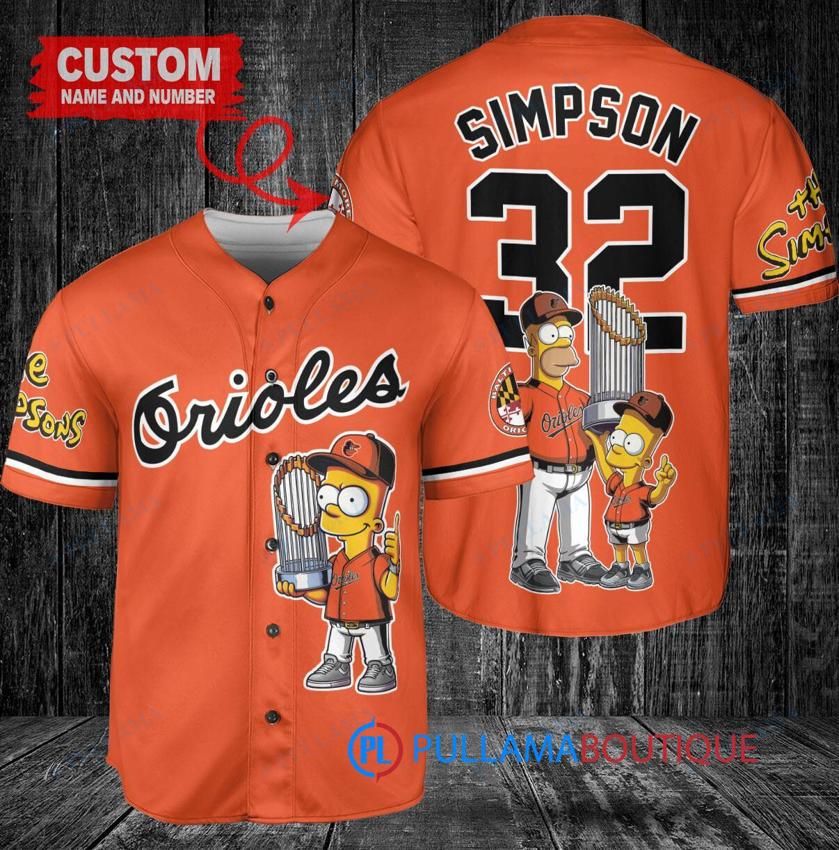 Show off your love for the Baltimore Orioles and The Simpsons with this custom baseball jersey featuring Bart Simpson, Homer Simpson, and Lisa Simpson holding a trophy. The jersey is designed in vibrant orange color, perfect for standing out in the crowd. Made with high-quality materials, this jersey is a must-have for any fan looking to add a fun and unique piece to their collection. Get ready to hit a home run in style with this one-of-a-kind baseball jersey!