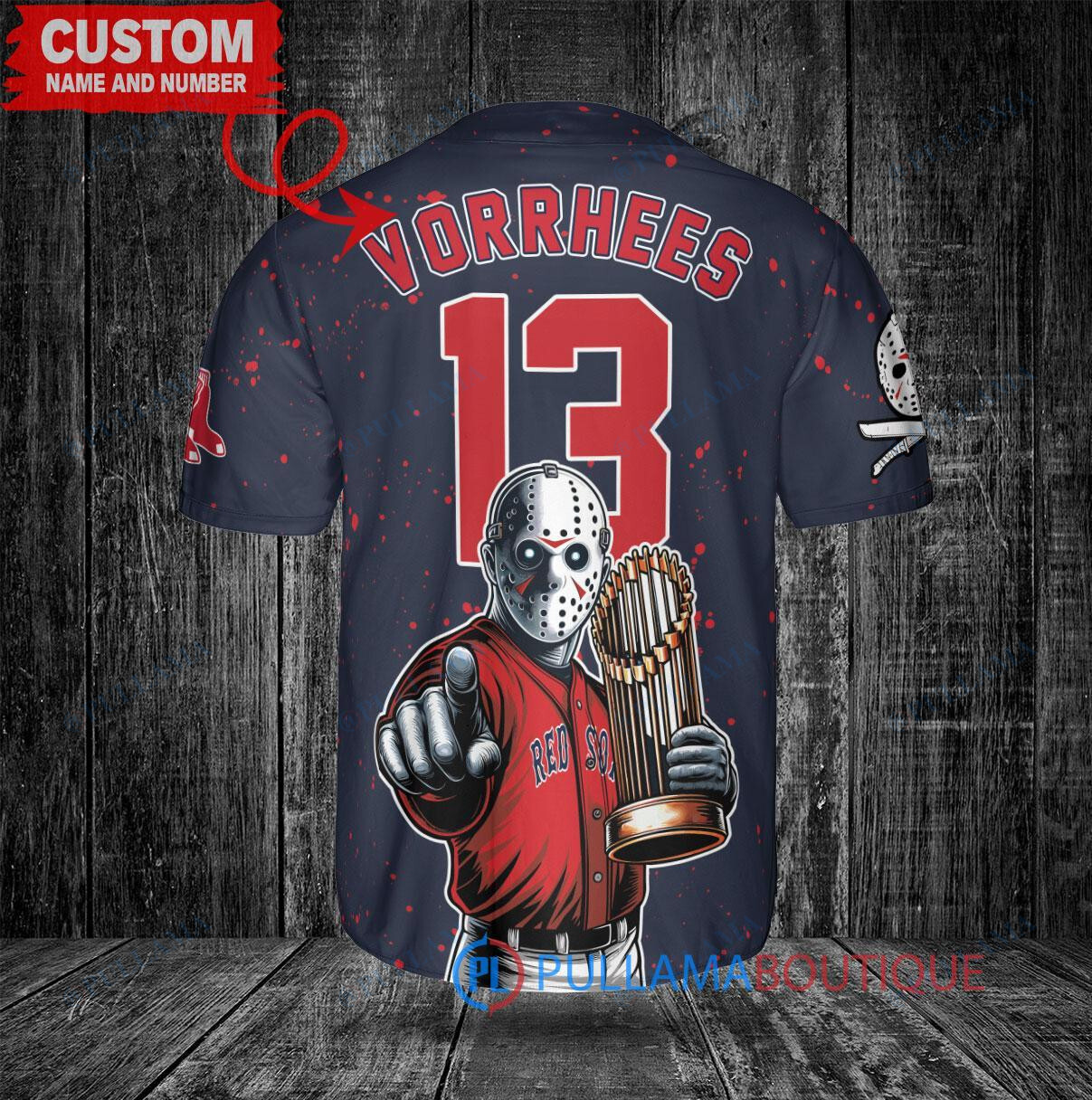Boston Red Sox x Friday the 13th Jason Voorhees Halloween with World Series Trophy Custom Baseball Jersey Navy