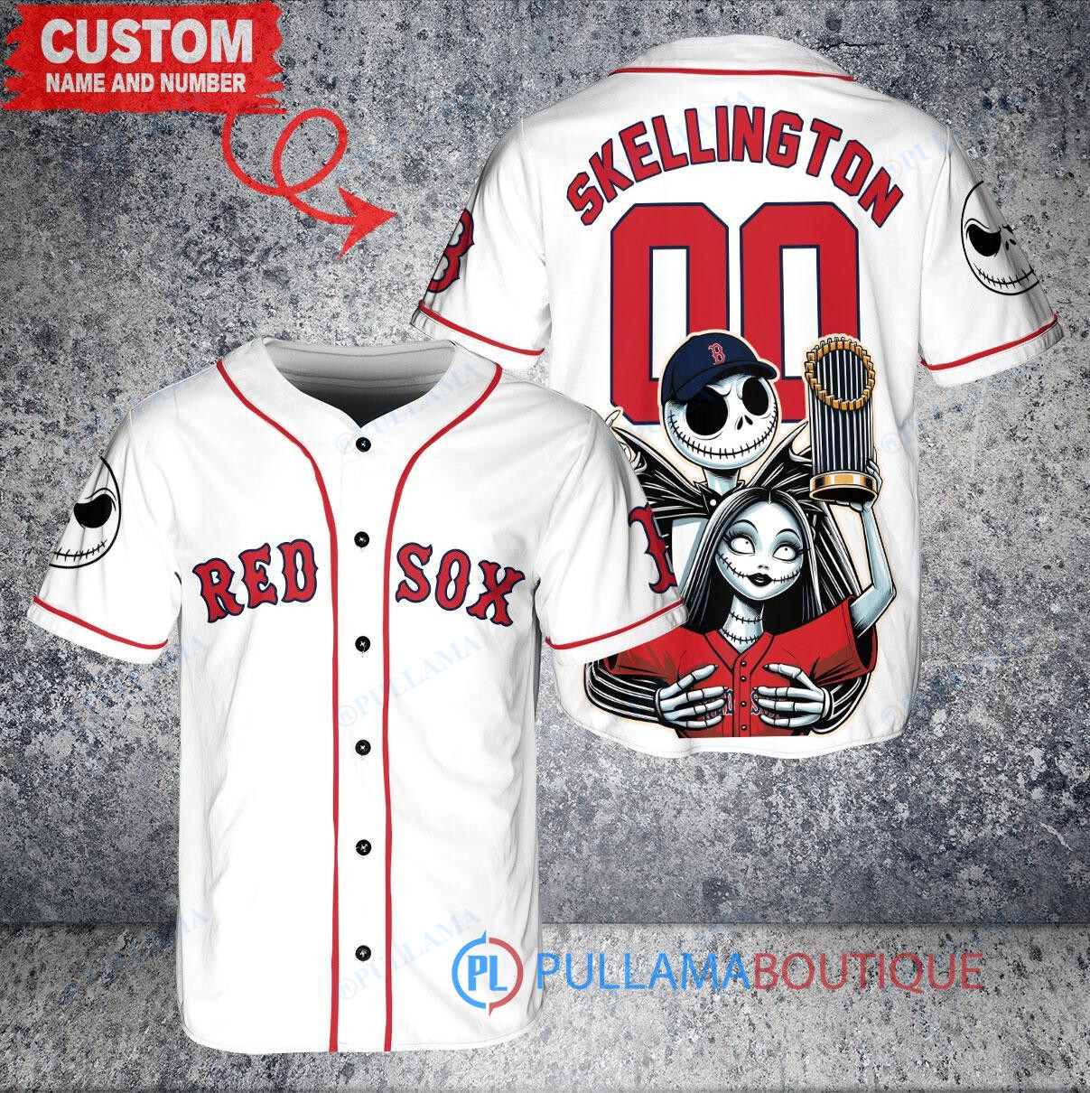 Show off your love for the Boston Red Sox and The Nightmare Before Christmas with this custom baseball jersey featuring Jack Skellington and Sally. The white jersey is adorned with a unique design of the iconic characters alongside the World Series Trophy, making it a must-have for any fan. Perfect for game days or casual wear, this jersey is sure to turn heads and showcase your unique style. Get yours today and stand out from the crowd!