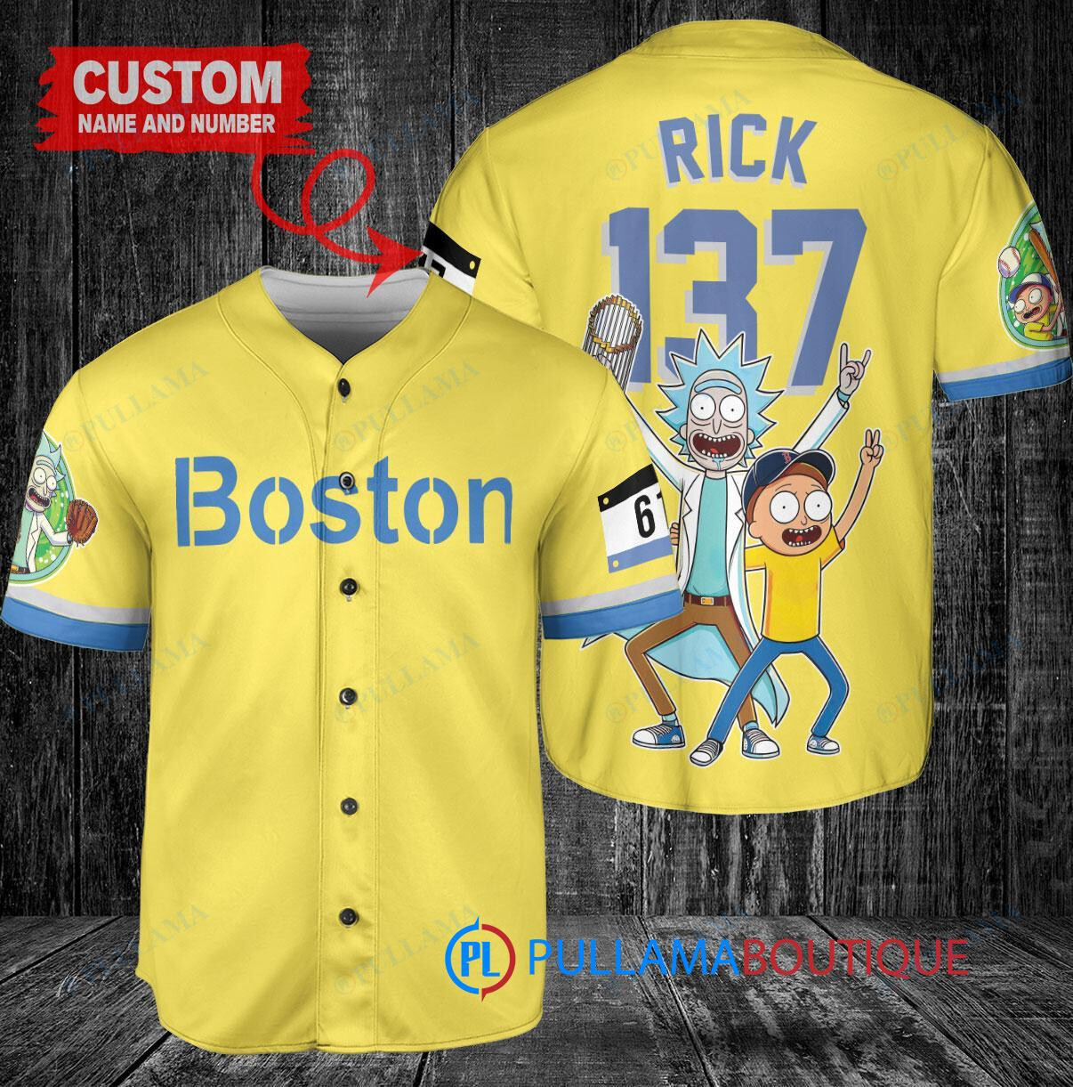 Show off your love for the Boston Red Sox and the hit TV show Rick and Morty with this custom baseball jersey. The jersey features a unique design with a trophy motif in gold and light blue colors, inspired by the City Connect series. Perfect for any fan looking to stand out in the crowd at the next game or event. Get yours today and hit a home run with your style!
