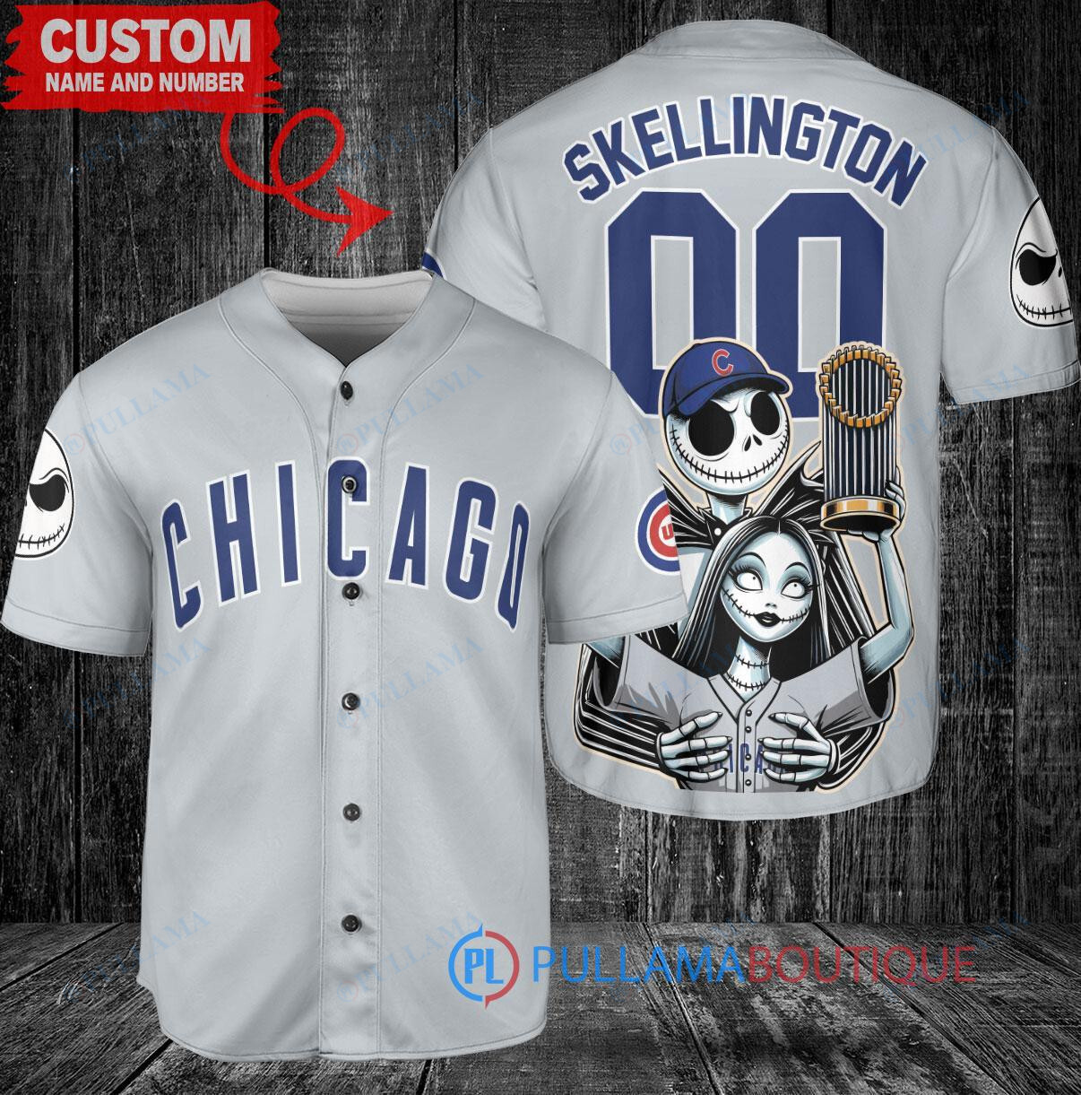 Show your love for the Chicago Cubs and celebrate their World Series victory with this unique Jack Skellington and Sally baseball jersey. The gray jersey features a spooky twist on the classic Cubs logo, perfect for any fan of both the team and the Nightmare Before Christmas. Get ready to stand out in the crowd and show off your team spirit in style!