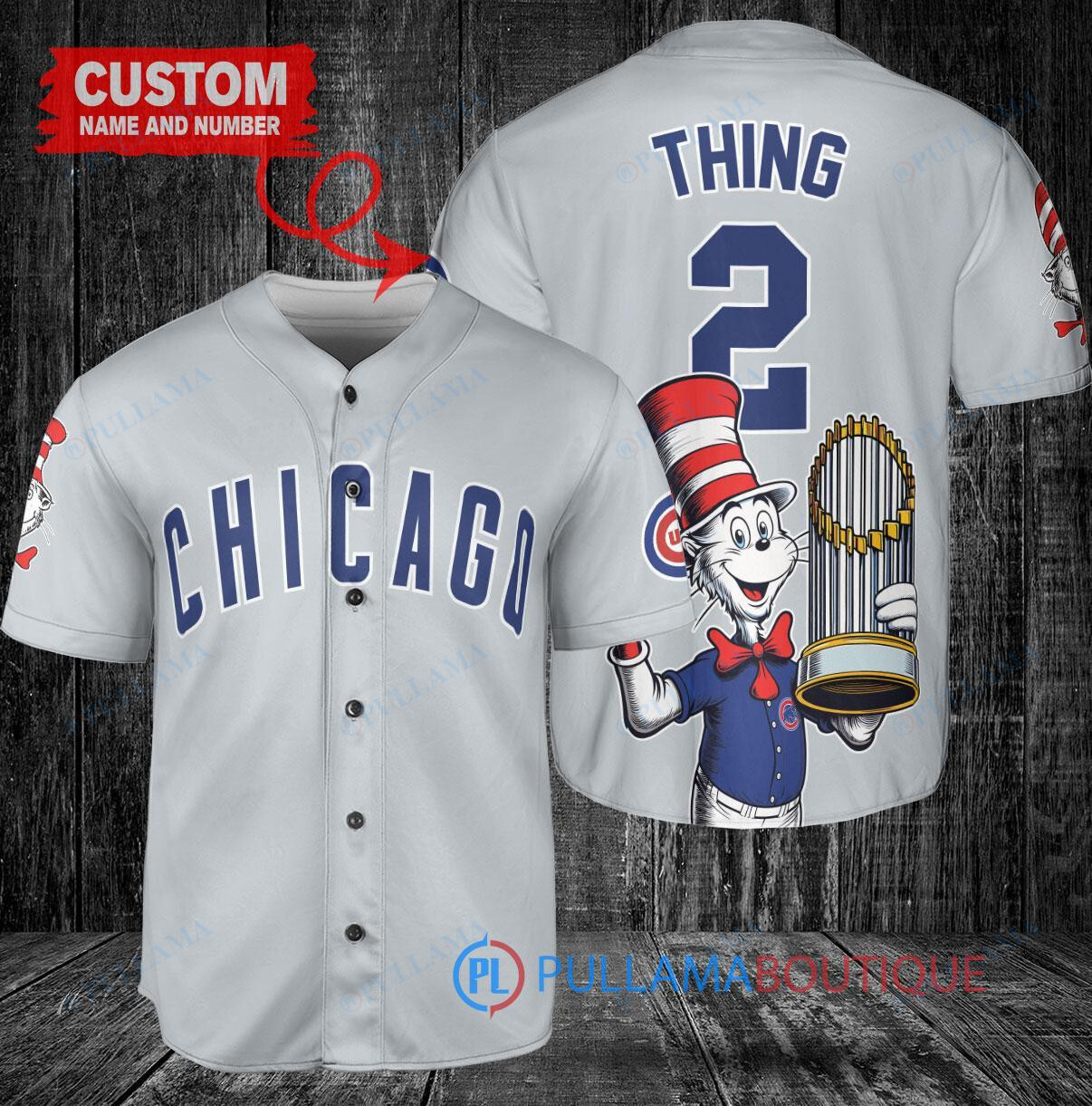 Chicago Cubs x Dr Seuss with World Series Trophy Custom Baseball Jersey Gray