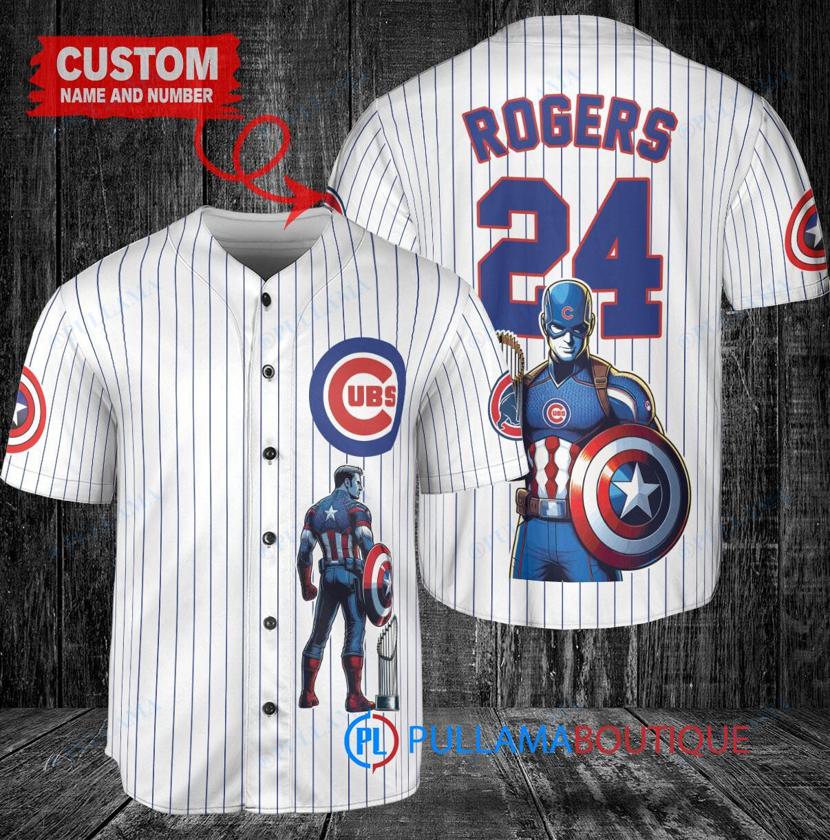 Show your support for the Chicago Cubs with this custom baseball jersey featuring a collaboration with Marvel’s Captain America, Steve Rogers. The jersey is designed in white with the iconic Captain America shield on the chest and Rogers’ name and number on the back. Perfect for any Cubs fan or Marvel enthusiast, this jersey is a unique and stylish way to celebrate your favorite team and superhero.