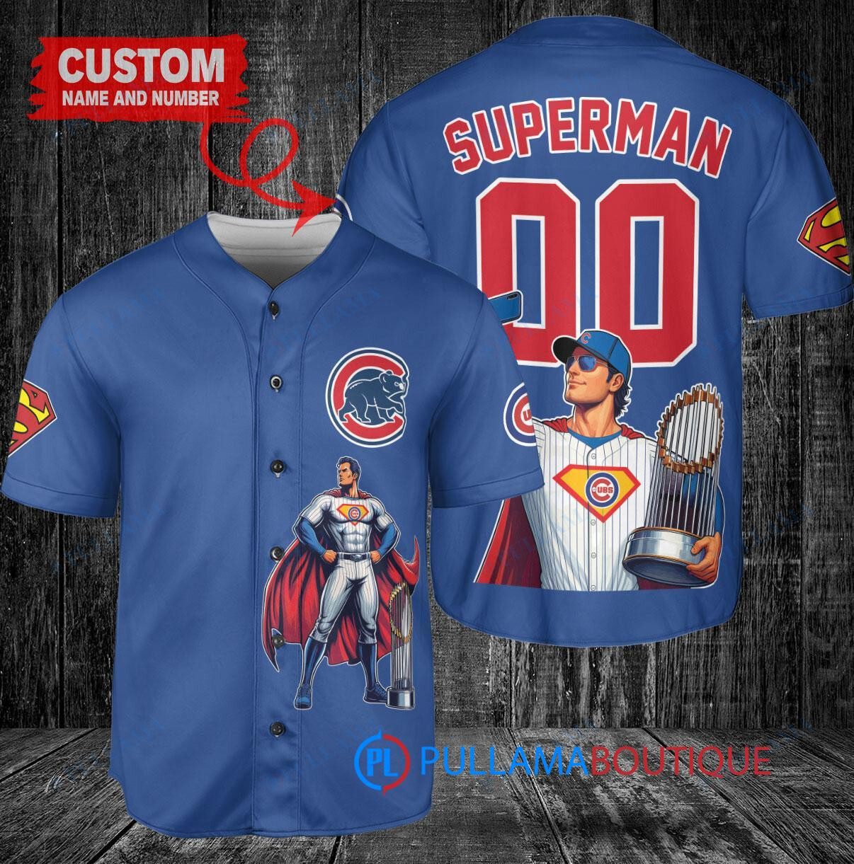 Show your support for the Chicago Cubs in a unique way with this custom baseball jersey featuring a Superman DC Comics design. The royal blue jersey is accented with the Cubs logo and a trophy graphic, making it a standout piece for any fan. Made with high-quality materials, this jersey is perfect for game days or casual wear. Get yours today and stand out from the crowd!