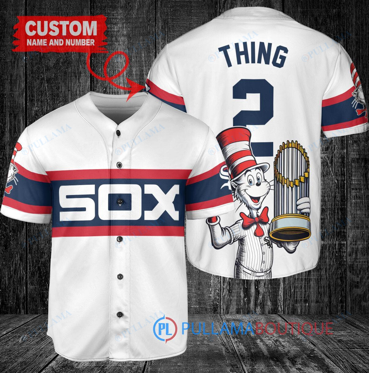 Show your love for the Chicago White Sox in a fun and whimsical way with this custom baseball jersey featuring a Dr. Seuss design and the World Series Trophy. This unique jersey is perfect for any White Sox fan looking to stand out in the crowd. The white stripe adds a classic touch to the vibrant and eye-catching design. Made with high-quality materials, this jersey is comfortable to wear while showing off your team spirit. Perfect for game days, watch parties, or everyday wear, this jersey is a must-have for any die-hard White Sox fan.