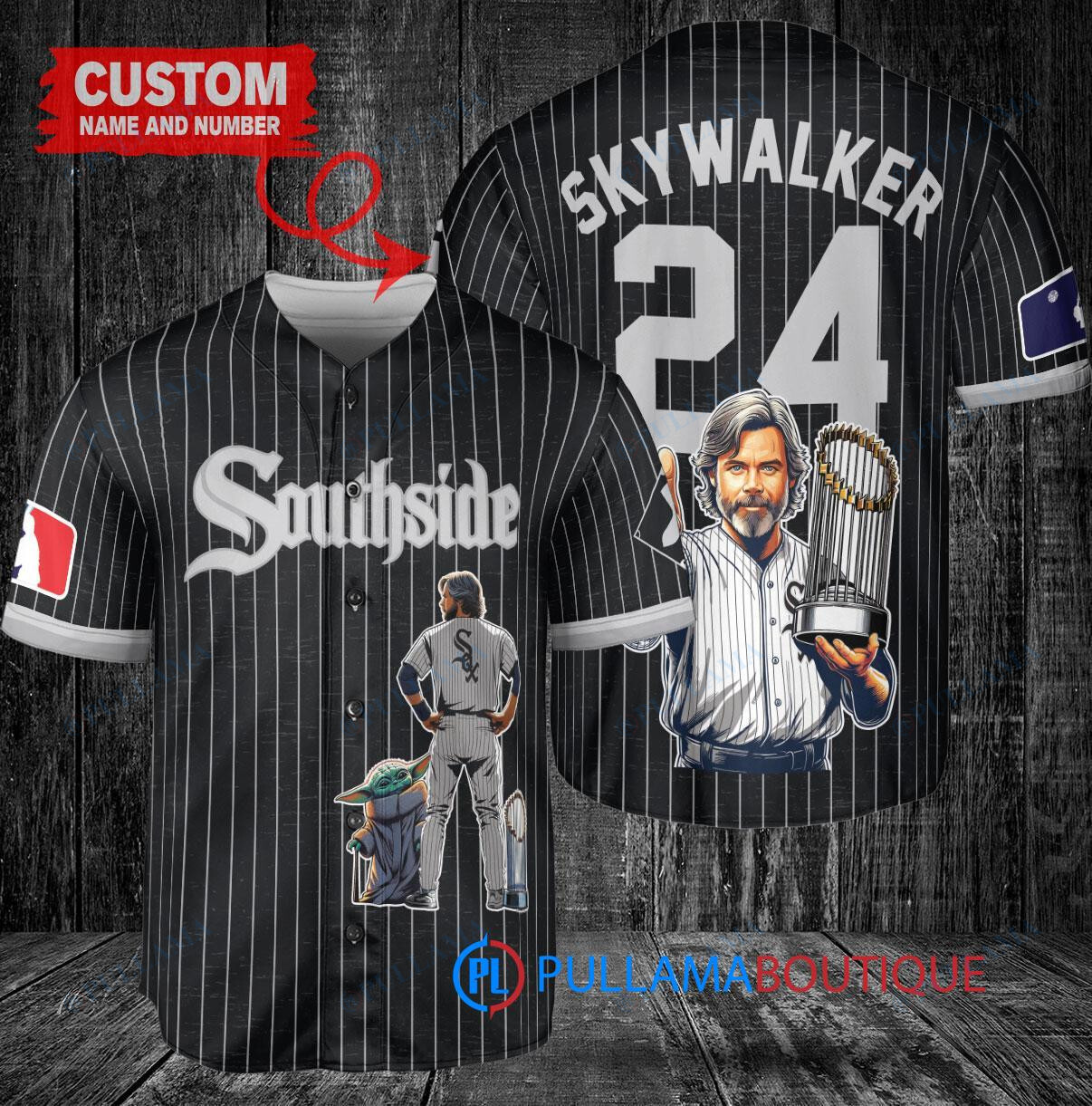 Show off your love for the Chicago White Sox and Star Wars with this custom baseball jersey featuring Luke Skywalker. This black City Connect jersey is perfect for any fan looking to stand out in the crowd. The jersey also includes a trophy design, adding a unique touch to your game day outfit. Get ready to represent your favorite team and galaxy far, far away in style!