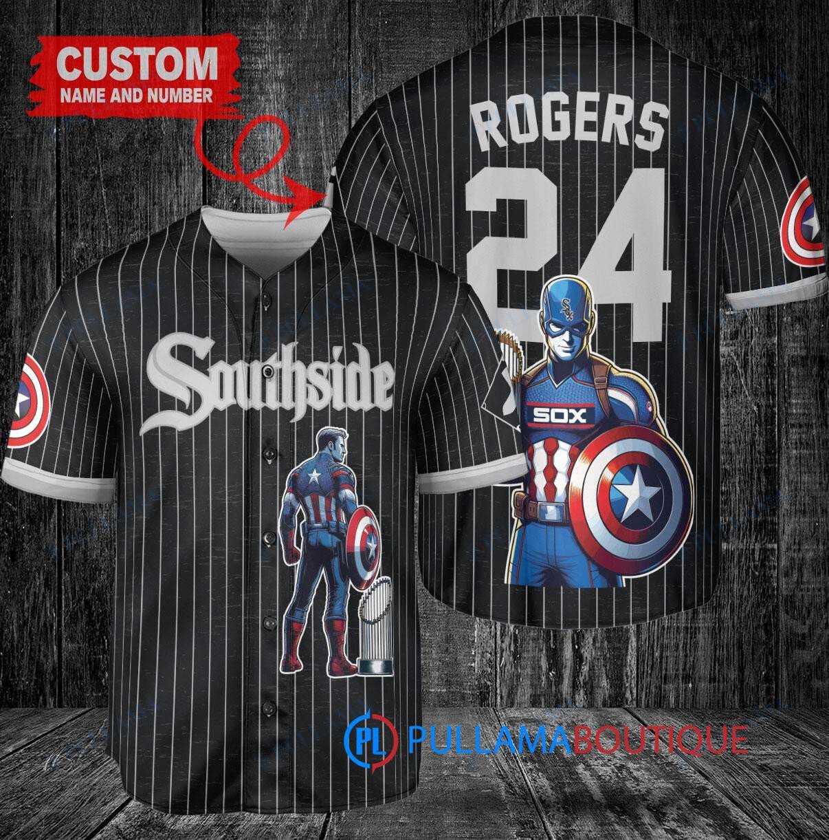 Show your support for the Chicago White Sox with this custom baseball jersey featuring Marvel’s Captain America Steve Rogers. The black City Connect design adds a unique and stylish touch, while the trophy detail on the jersey adds a special touch. Perfect for any baseball fan or Marvel enthusiast, this jersey is a must-have for your collection.