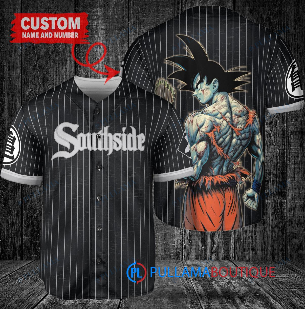 Show off your love for both the Chicago White Sox and Dragon Ball Z with this unique baseball jersey featuring Son Goku Kakarot in his Super Saiyan form. The black City Connect jersey is designed with a trophy emblem, perfect for any fan looking to stand out in the crowd. Made with high-quality materials, this jersey is a must-have for any baseball and anime enthusiast.