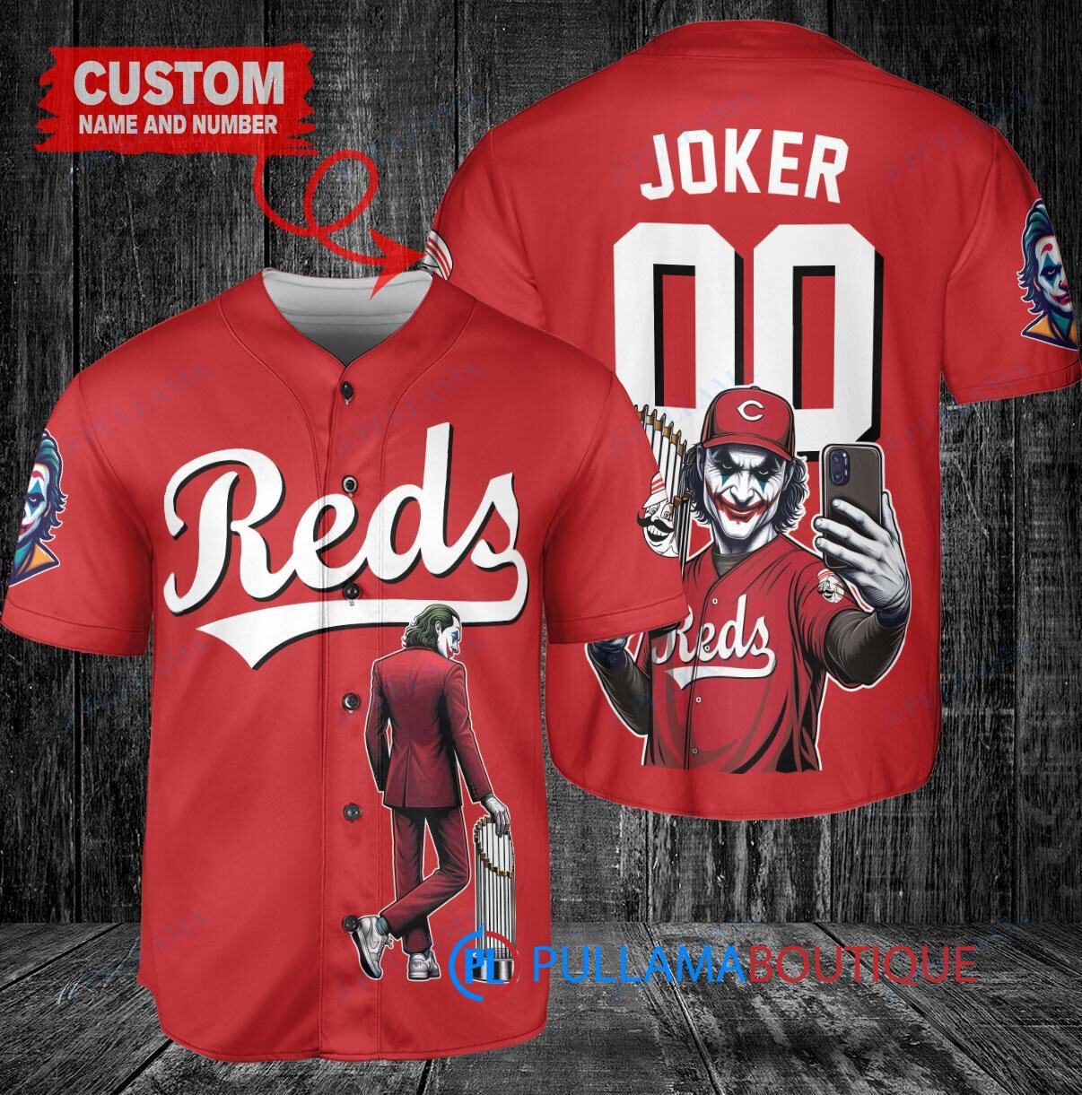 Show off your love for the Cincinnati Reds and the Joker from DC Comics with this custom baseball jersey in red. This jersey features a unique design with the Joker holding a trophy, perfect for any fan looking to stand out in the crowd. Made with high-quality materials, this jersey is comfortable to wear while showing off your favorite team and character. Perfect for game days, comic conventions, or just hanging out with friends, this jersey is a must-have for any true fan.