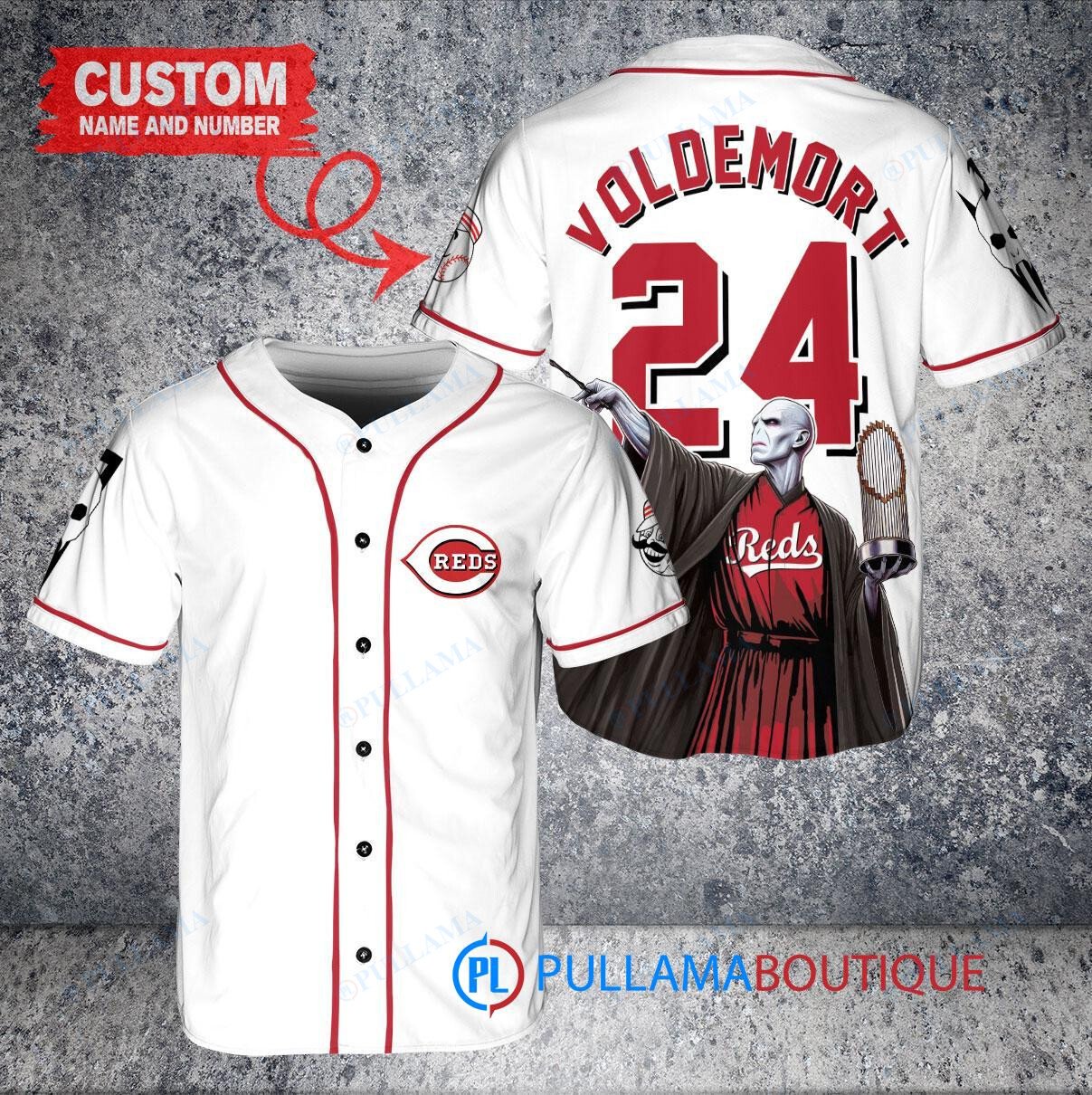 Show off your love for the Cincinnati Reds and Harry Potter with this custom baseball jersey featuring Lord Voldemort. This white jersey is perfect for any fan looking to stand out in the crowd. The jersey also comes with a trophy design, adding a unique touch to your game day outfit. Get ready to cast a spell on the competition with this one-of-a-kind jersey!