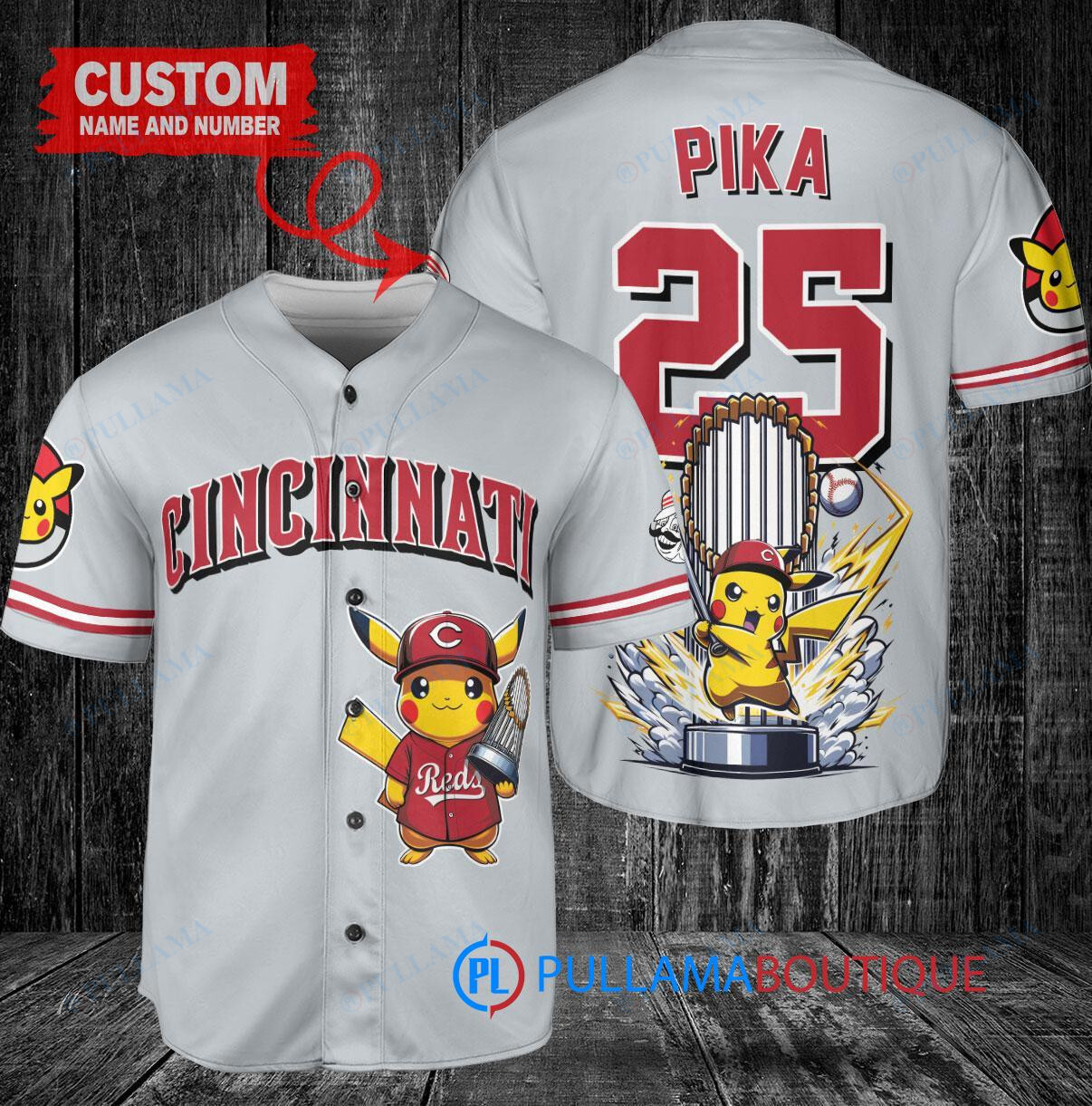 Show off your love for the Cincinnati Reds and Pikachu with this custom baseball jersey in gray. This unique jersey features Pikachu Pokemon holding a trophy, perfect for any baseball and Pokemon fan. Made with high-quality materials, this jersey is comfortable to wear while showing off your favorite team and character. Perfect for game days or casual wear, this jersey is a must-have for any fan.