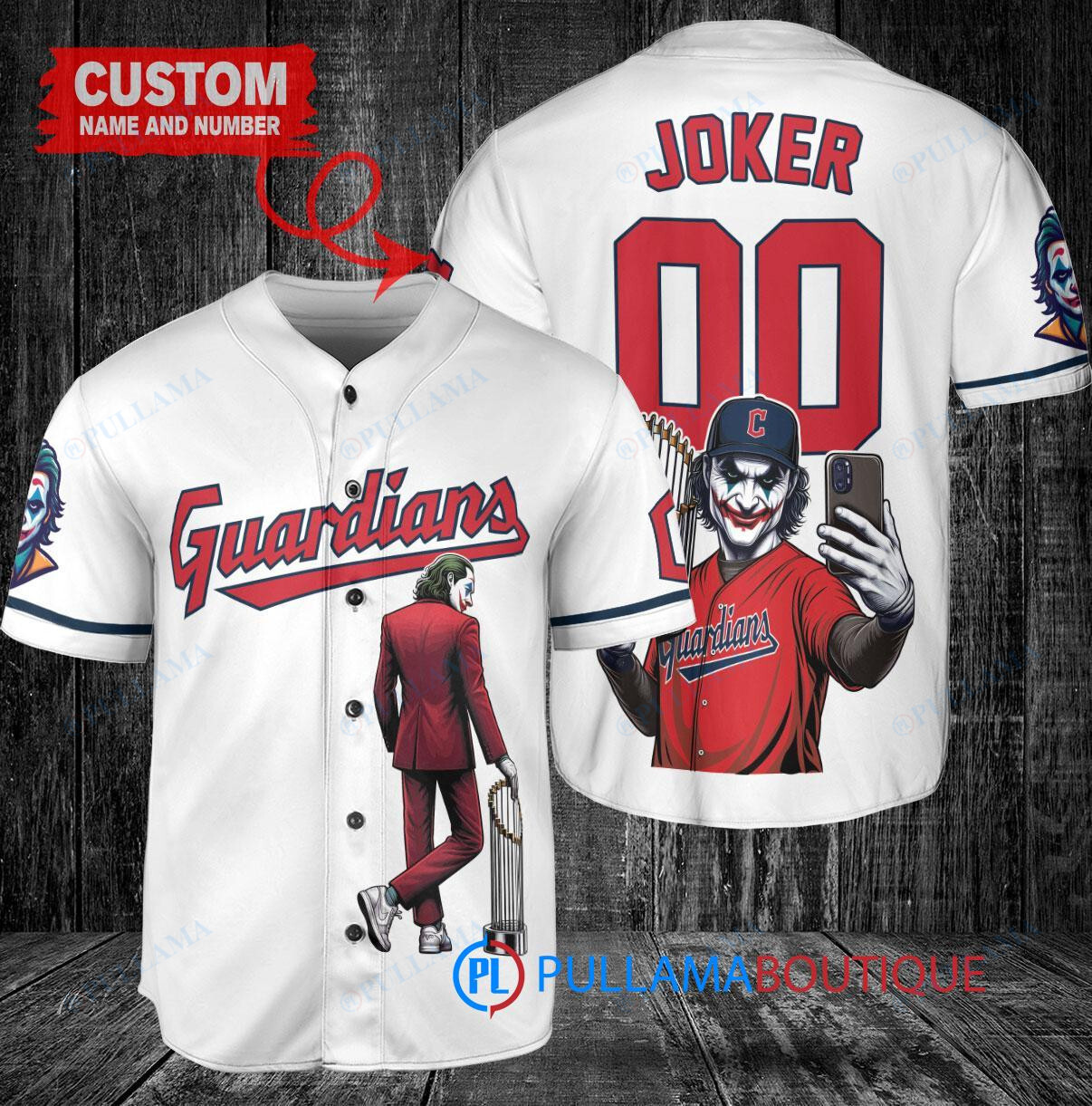 Show off your love for the Cleveland Guardians and the Joker from DC Comics with this custom baseball jersey. The white jersey features a unique design combining elements from both franchises, including the Guardians logo and the Joker’s iconic imagery. Perfect for fans looking to stand out at the ballpark or comic conventions. Made with high-quality materials, this jersey also includes a trophy design to add an extra touch of flair. Get ready to turn heads with this one-of-a-kind piece!