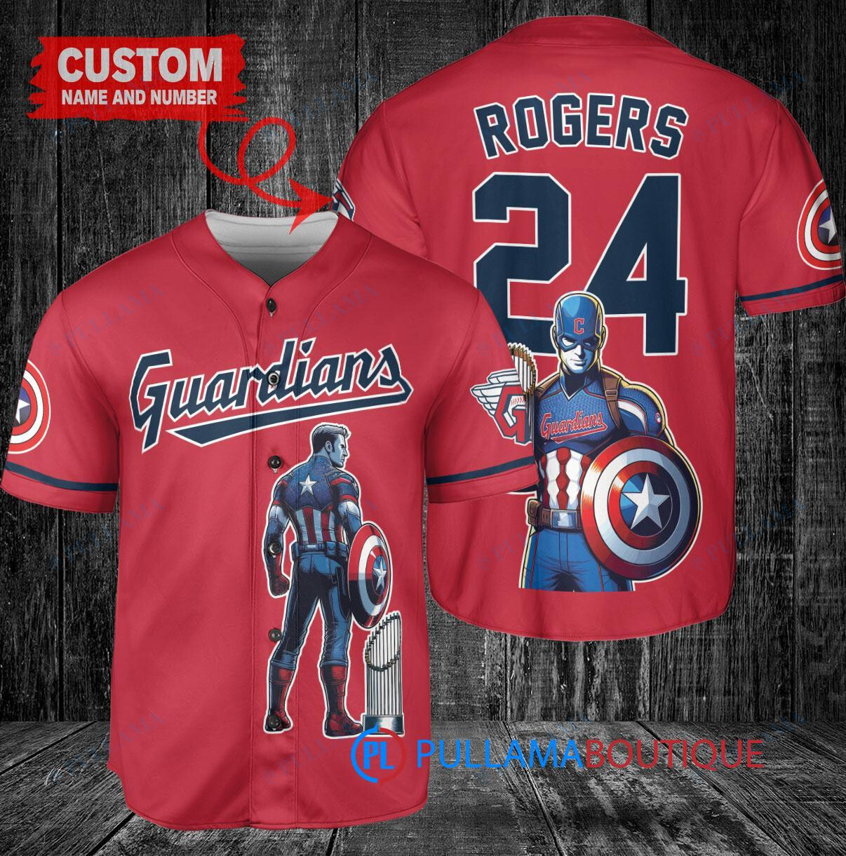 Show your support for the Cleveland Guardians with this custom baseball jersey featuring Marvel’s Captain America, Steve Rogers, holding a trophy. The jersey is designed in red with the Guardians logo and is perfect for any baseball fan or Marvel enthusiast. Made with high-quality materials, this jersey is comfortable to wear while showcasing your love for both the Guardians and Captain America. Perfect for game days or casual wear, this jersey is a must-have for any fan collection.