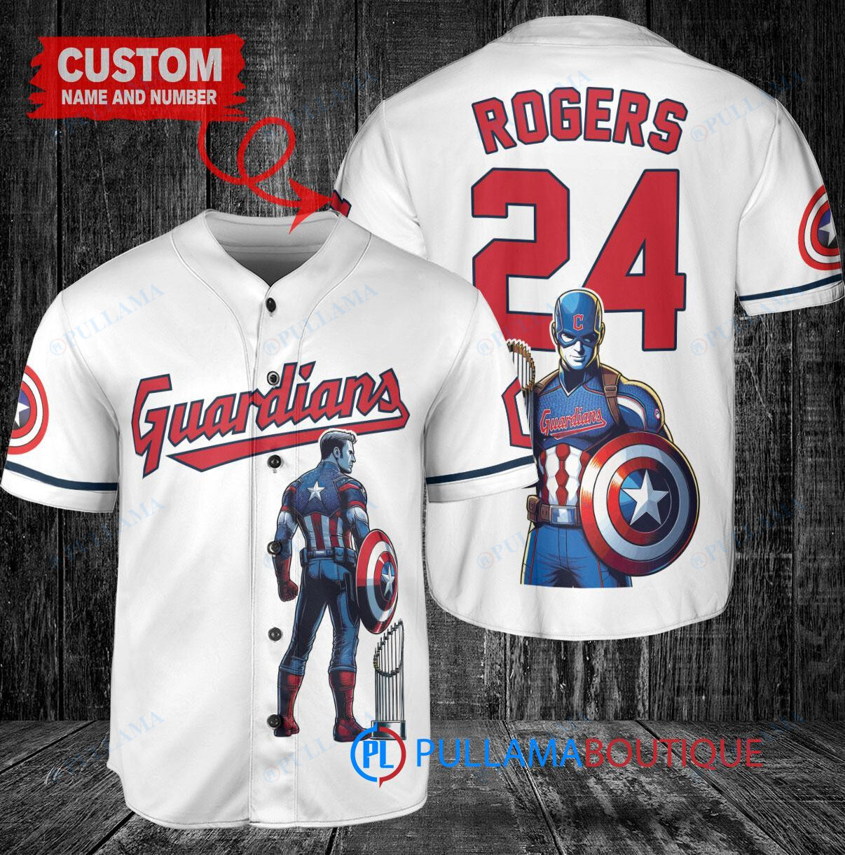 Show your support for the Cleveland Guardians with this custom baseball jersey featuring Marvel’s Captain America, Steve Rogers, holding a trophy. This white jersey is perfect for any fan looking to stand out in the crowd. Made with high-quality materials, this jersey is comfortable to wear while showcasing your love for both the Guardians and Captain America. Perfect for game days or casual wear, this jersey is a must-have for any true fan.