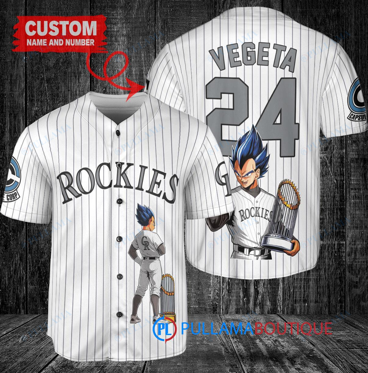 Show off your love for the Colorado Rockies and Dragon Ball Z with this custom baseball jersey featuring Vegeta in his Super Saiyan form. The white jersey is designed with a trophy graphic, perfect for any fan looking to stand out in the crowd. Made with high-quality materials, this jersey is a must-have for any baseball and anime enthusiast.