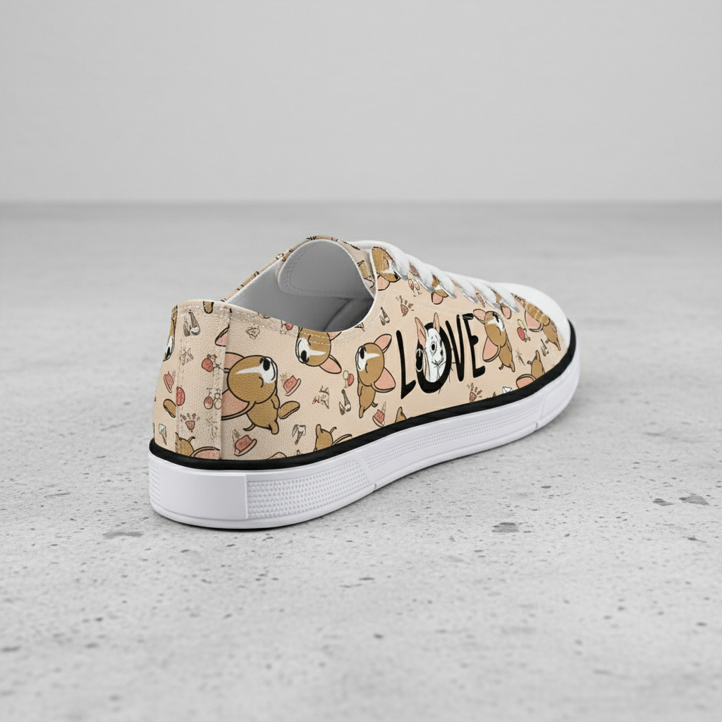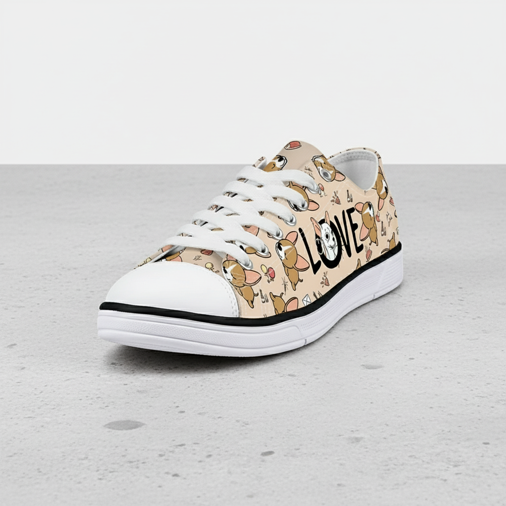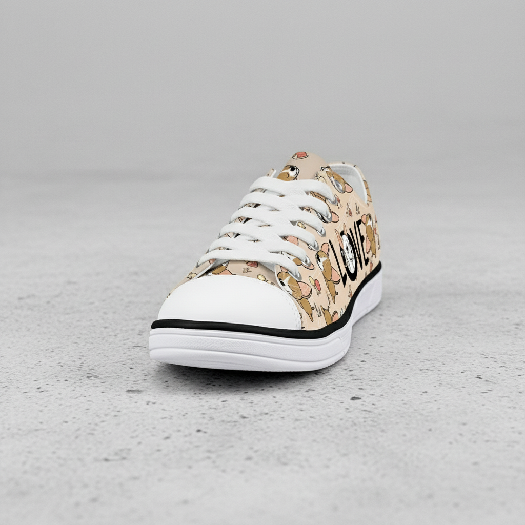 Cute Dog Print Low Top Canvas Sneakers for Women – Casual Lace-Up Walking Shoes with LOVE Graphic Design – Tan