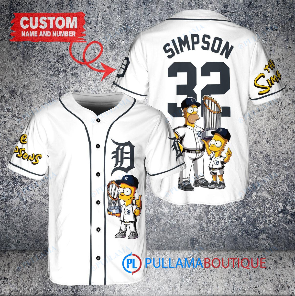 Show your love for the Detroit Tigers and The Simpsons with this custom baseball jersey featuring Bart Simpson, Homer Simpson, and Lisa Simpson holding a trophy. This white jersey is perfect for any fan looking to stand out in the crowd. Made with high-quality materials, this jersey is comfortable to wear while showing off your unique style. Perfect for game days, casual wear, or as a gift for any baseball and The Simpsons enthusiast. Get yours today and hit a home run with your style!