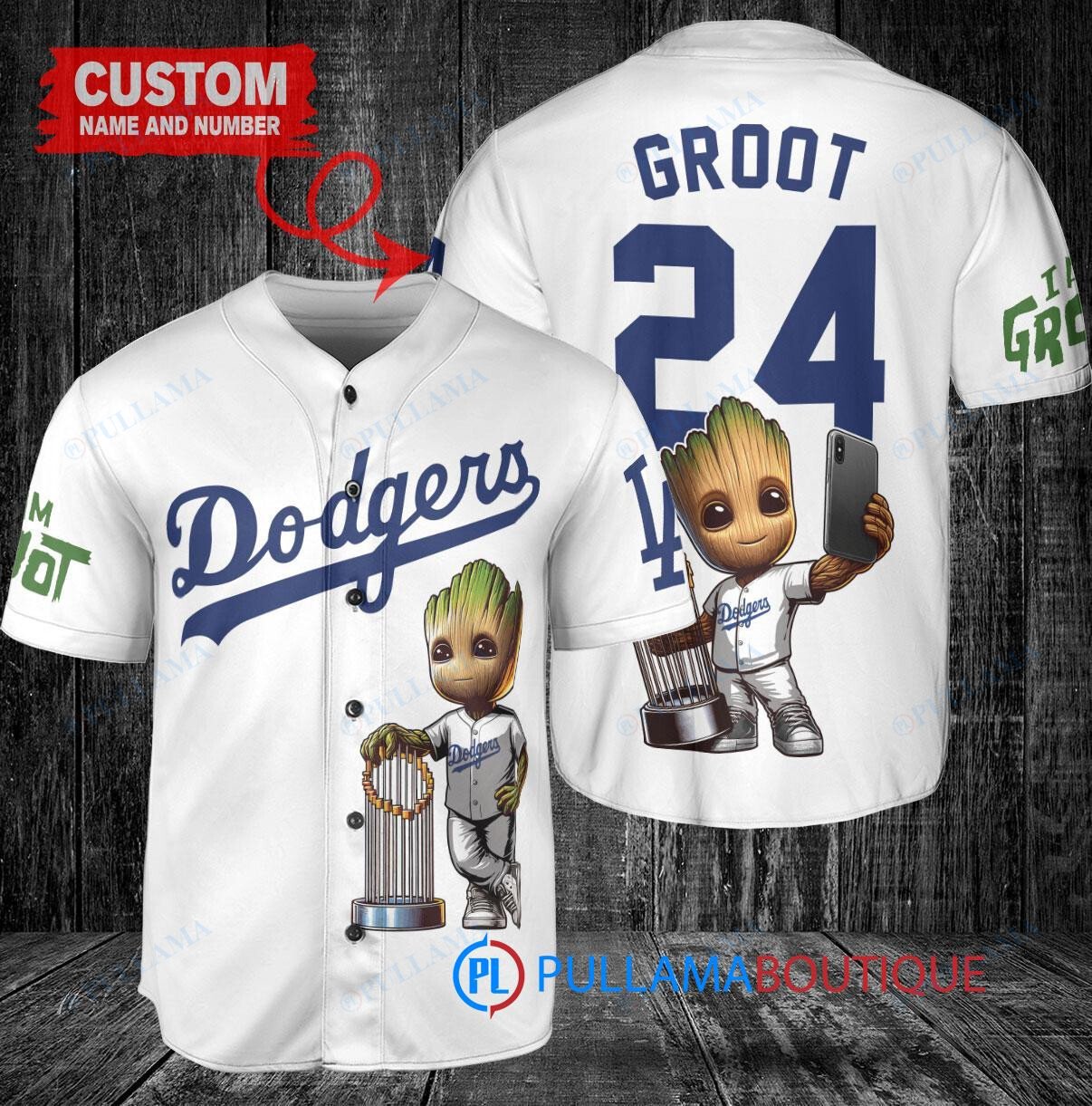 Show off your love for the Dodgers and Marvel with this unique baseball jersey featuring Baby Groot from Guardians of the Galaxy. This white jersey is perfect for any fan looking to stand out in the crowd. Made with high-quality materials, this jersey is comfortable to wear at the game or just hanging out with friends. Get your hands on this one-of-a-kind piece and show your support for your favorite team and superhero!