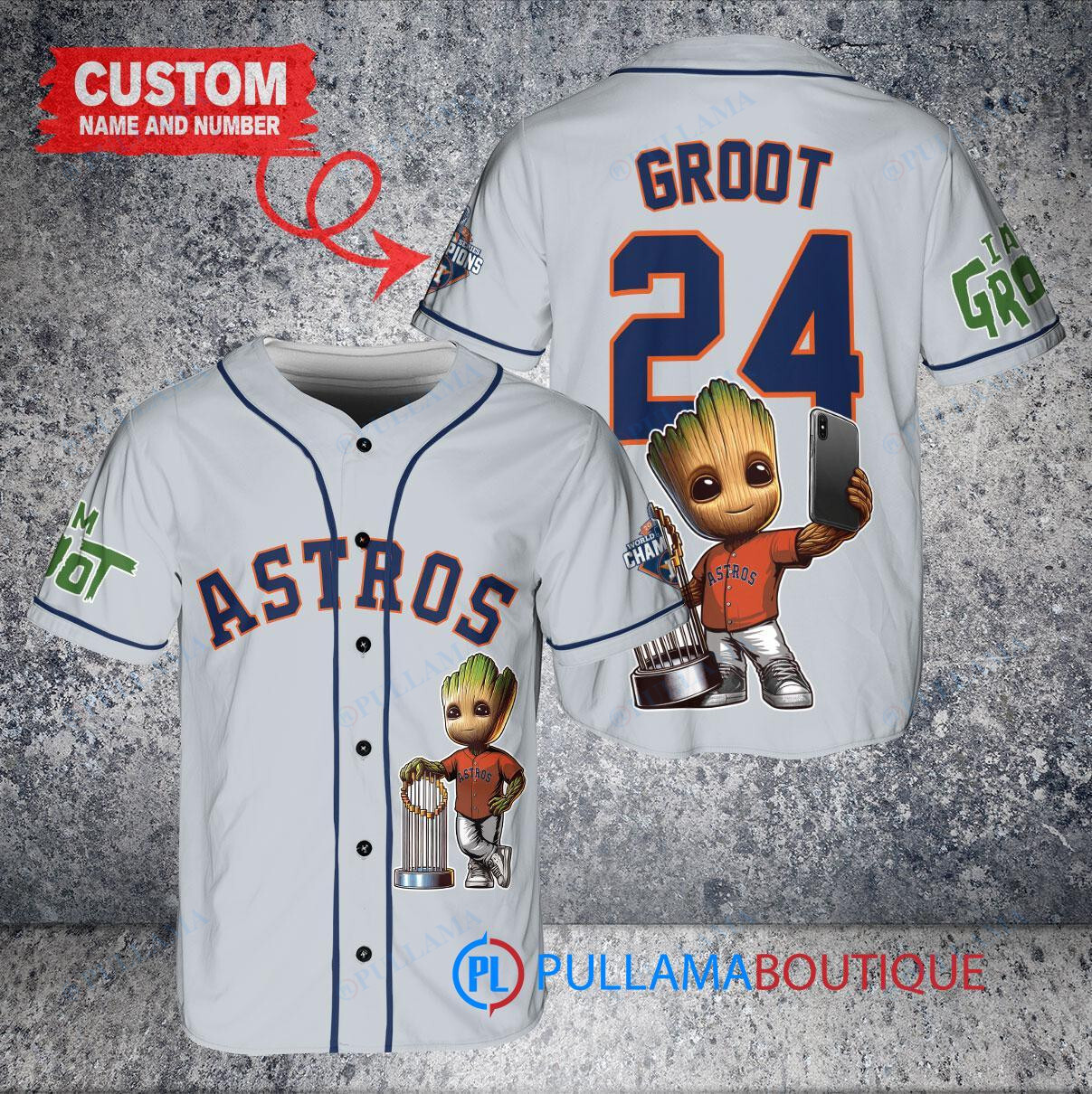 Houston Astros x Baby Groot Marvel Guardians Of The Galaxy with Trophy Custom Baseball Jersey Gray