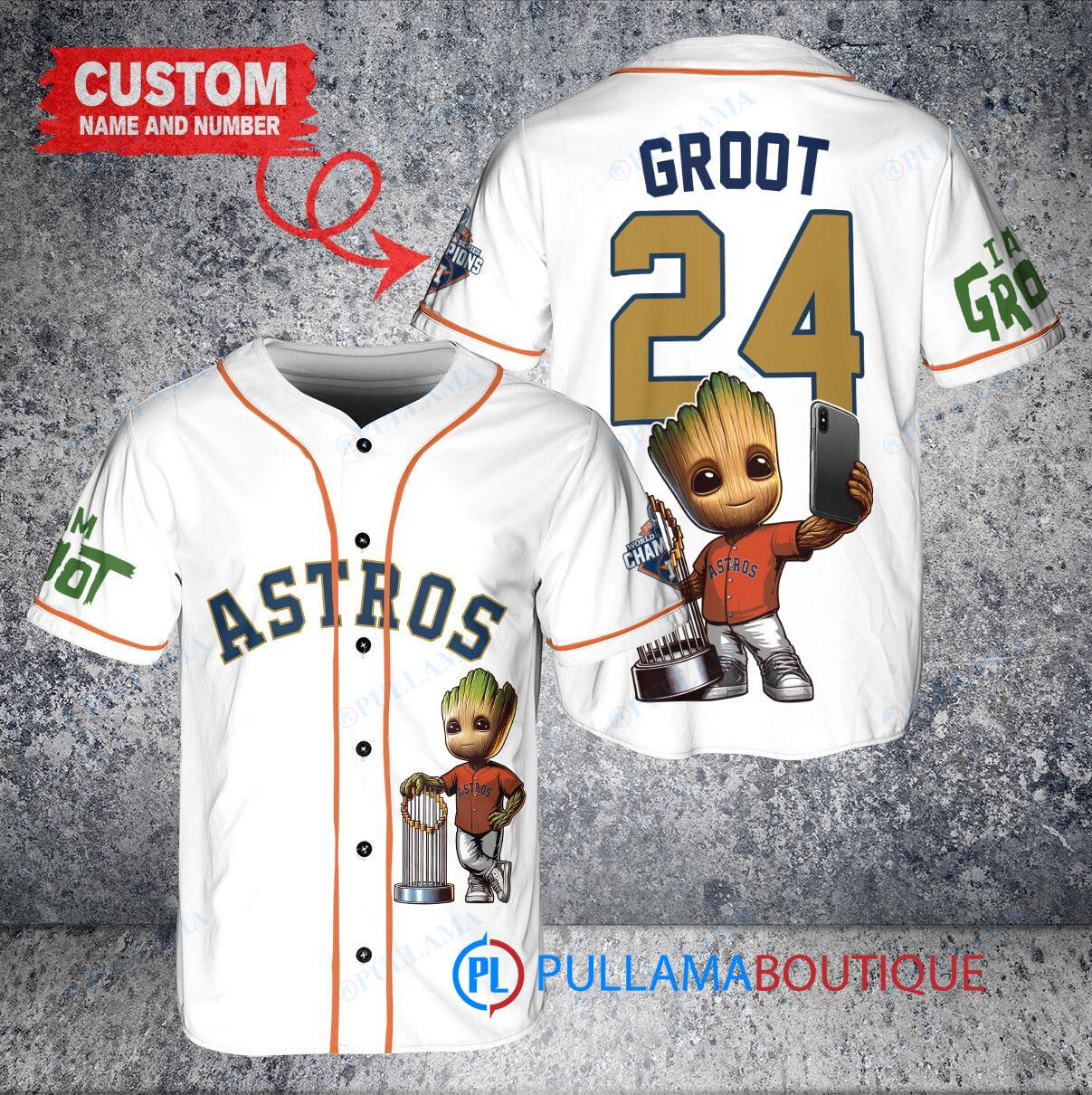Houston Astros x Baby Groot Marvel Guardians Of The Galaxy with Trophy Custom Baseball Jersey White