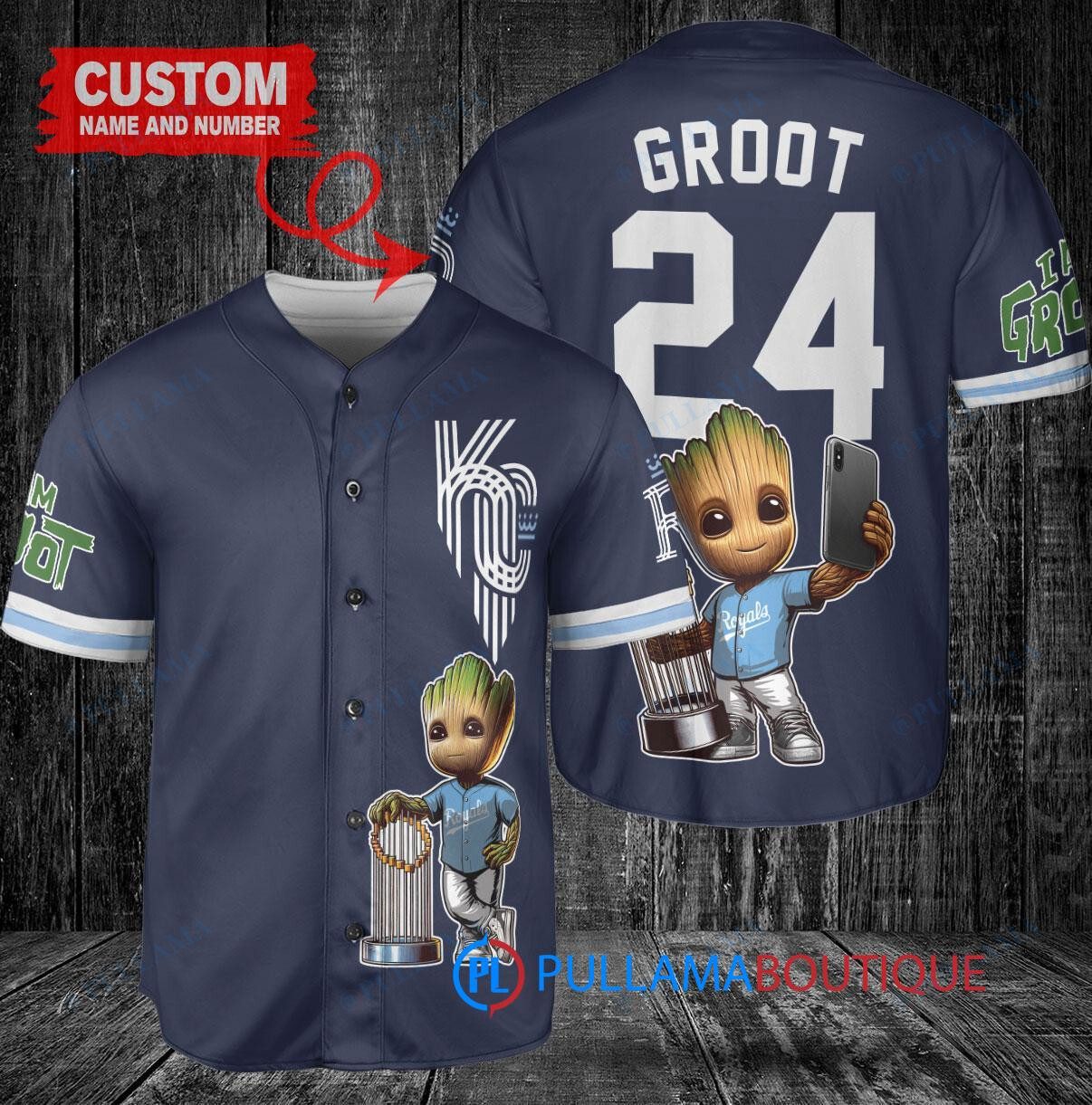 Kansas City Royals x Baby Groot Marvel Guardians Of The Galaxy with Trophy Custom Baseball Jersey Navy