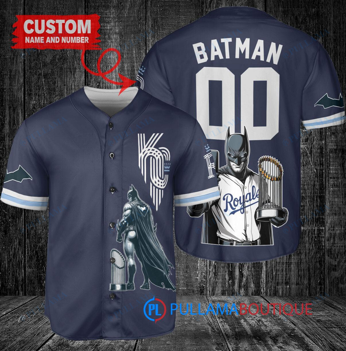 Kansas City Royals x DC Comics Batman The Dark Knight with Trophy Custom Baseball Jersey Navy