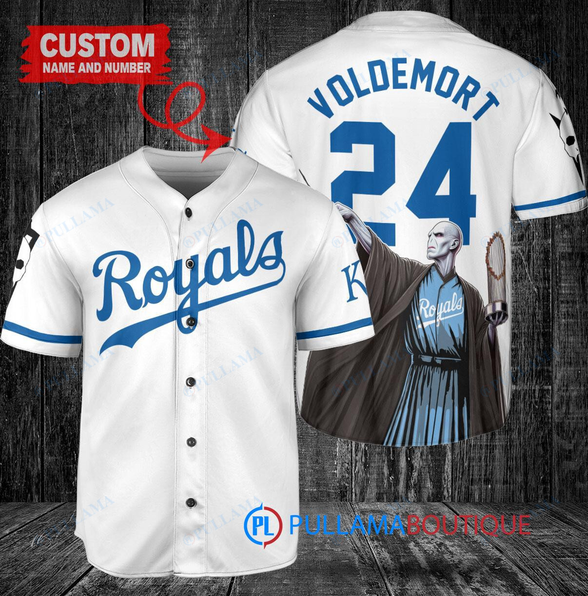 Show off your love for both the Kansas City Royals and Harry Potter with this custom baseball jersey featuring Lord Voldemort holding a trophy. This white jersey is perfect for any fan looking to stand out in the crowd. Made with high-quality materials, this jersey is a must-have for any collector or fan of the wizarding world.