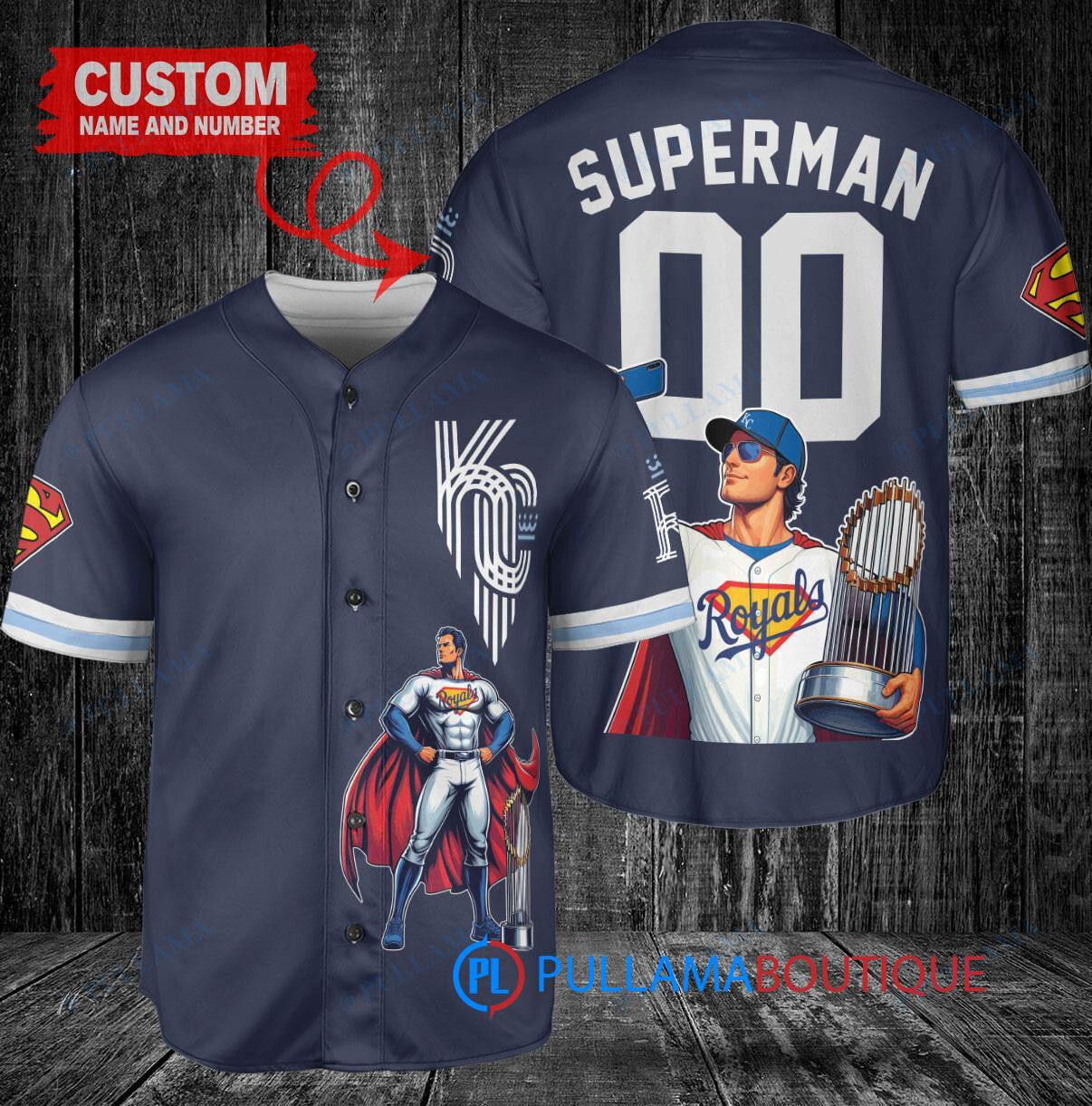 Show off your love for the Kansas City Royals and Superman with this custom baseball jersey featuring a unique DC Comics design. The navy jersey is adorned with the Royals logo and Superman emblem, making it a must-have for any fan. Perfect for wearing to games or just showing off your team pride, this jersey is sure to be a hit. Get yours today and add a touch of superhero flair to your game day outfit!