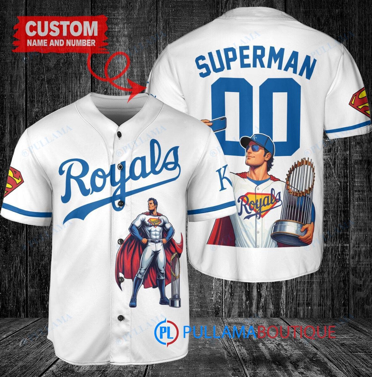 Kansas City Royals x Superman DC Comics with Trophy Custom Baseball Jersey White