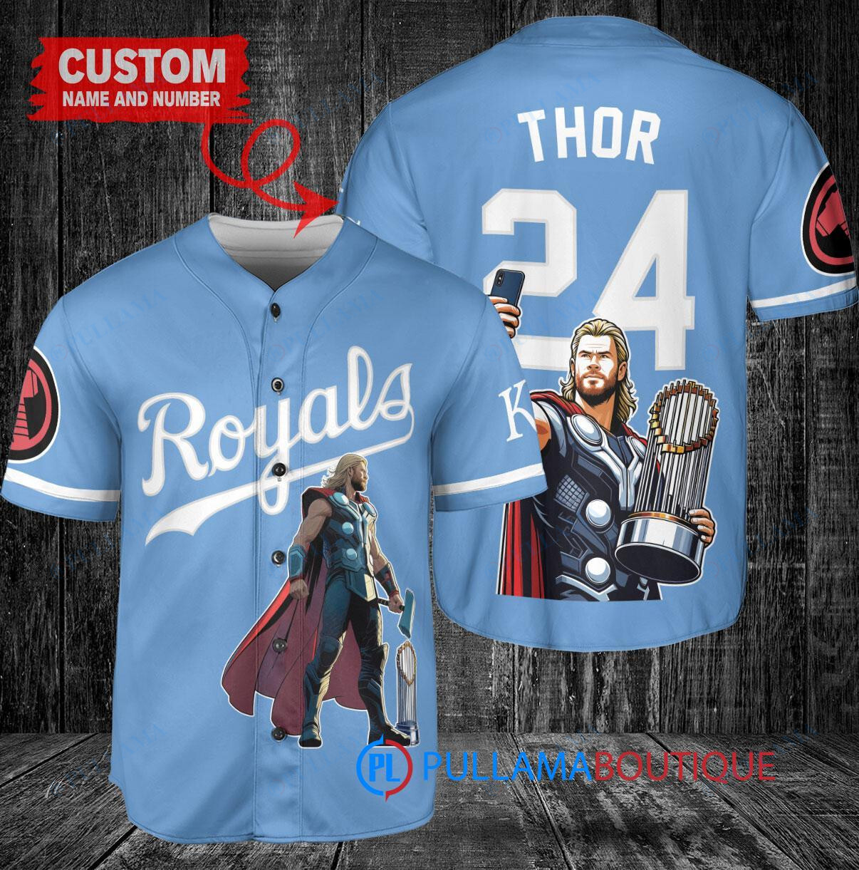 Kansas City Royals x Thor Marvel with Trophy Custom Baseball Jersey Light Blue