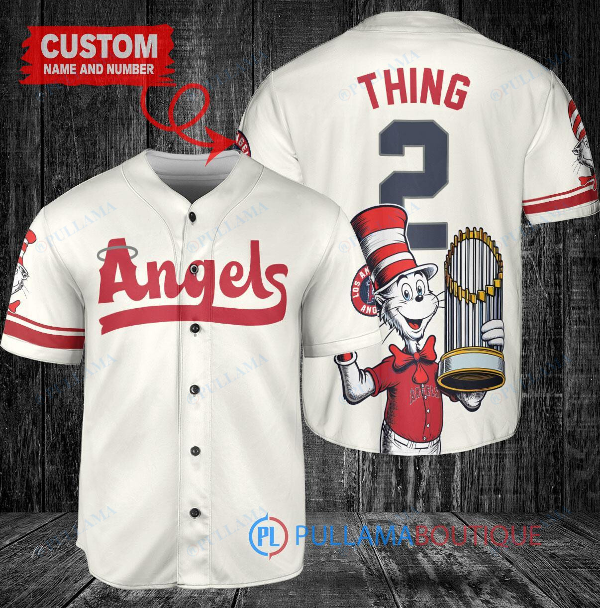 Show your love for the Los Angeles Angels in a whimsical way with this custom baseball jersey featuring a Dr. Seuss design and the World Series Trophy. This cream-colored jersey is perfect for any Angels fan looking to stand out in the crowd. Made with high-quality materials, this jersey is both stylish and comfortable to wear to the game or around town. Get ready to cheer on the Angels in style with this unique and eye-catching baseball jersey.
