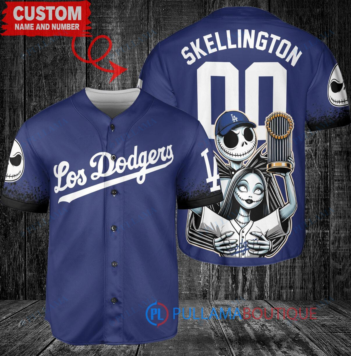 Show off your love for the Los Angeles Dodgers and The Nightmare Before Christmas with this custom baseball jersey featuring Jack Skellington and Sally. The jersey is designed in the team’s royal city connect colors and includes a World Series Trophy graphic. Perfect for any fan looking to stand out in the crowd!