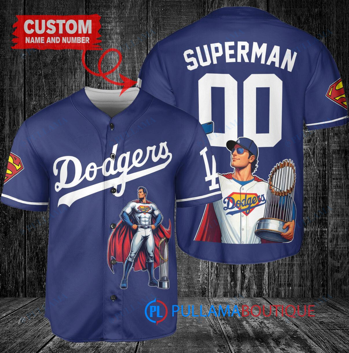 Los Angeles Dodgers x Superman DC Comics with Trophy Custom Baseball Jersey Navy