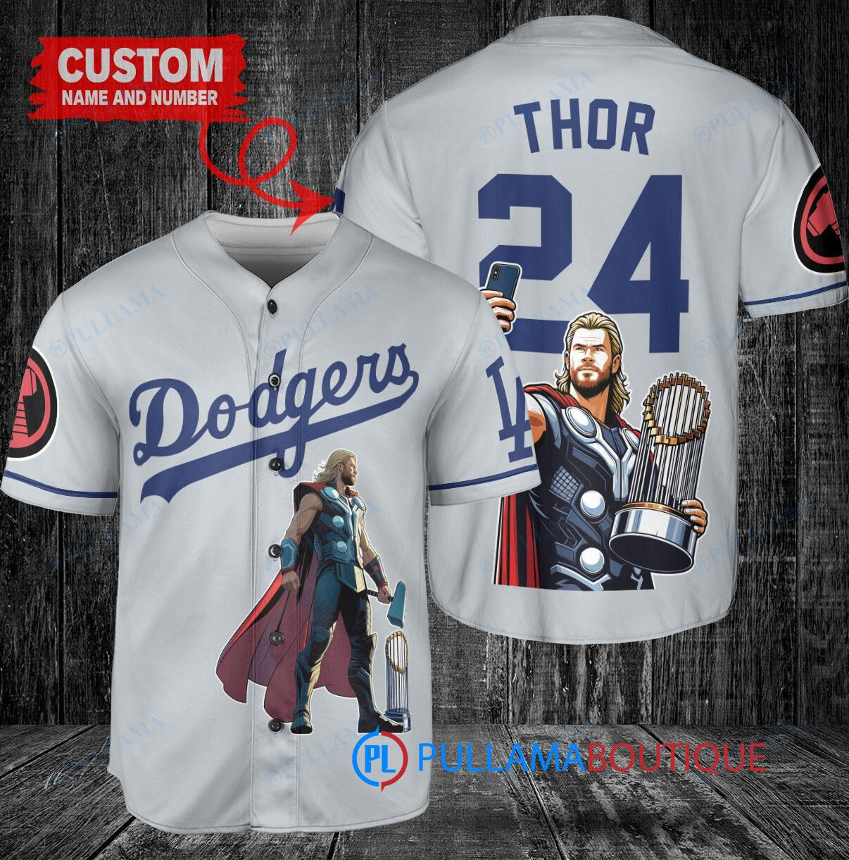 Los Angeles Dodgers x Thor Marvel with Trophy Custom Baseball Jersey Gray