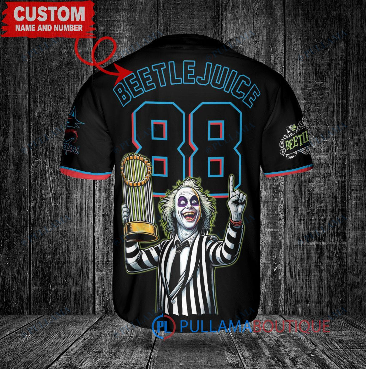 Get into the Halloween spirit with this Miami Marlins Beetlejuice World Series Trophy Baseball Jersey in black. This unique jersey features a spooky Beetlejuice design, perfect for celebrating the World Series. Made with high-quality materials, this jersey is comfortable to wear while showing off your team spirit. Perfect for any Miami Marlins fan looking to stand out from the crowd this Halloween season.