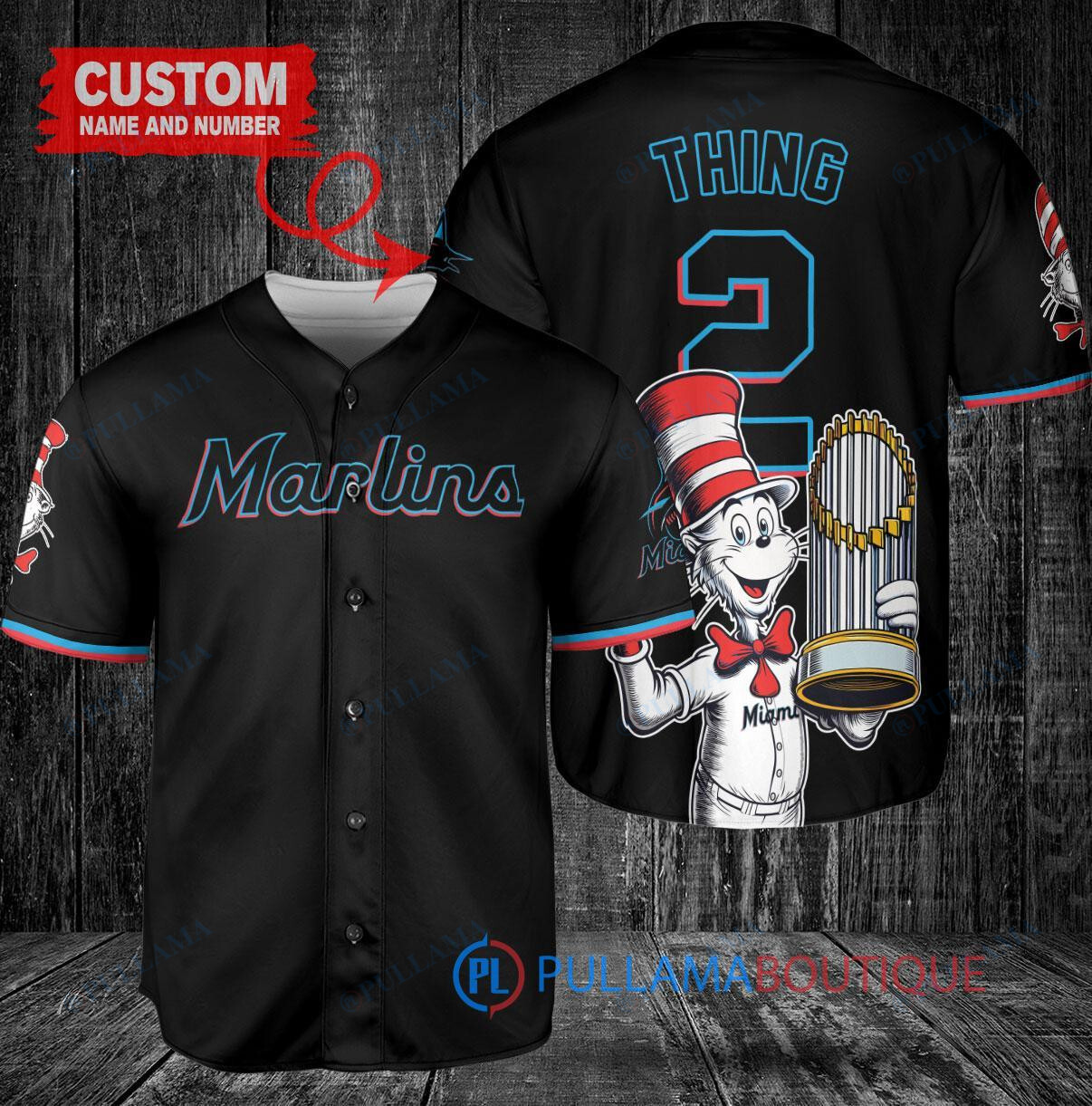 Show off your Miami Marlins pride with this custom baseball jersey featuring a fun Dr. Seuss design and the World Series Trophy. The black jersey is perfect for any fan looking to stand out in the crowd. Made with high-quality materials, this jersey is comfortable to wear while cheering on your favorite team. Get ready to turn heads and show your support for the Miami Marlins in style!
